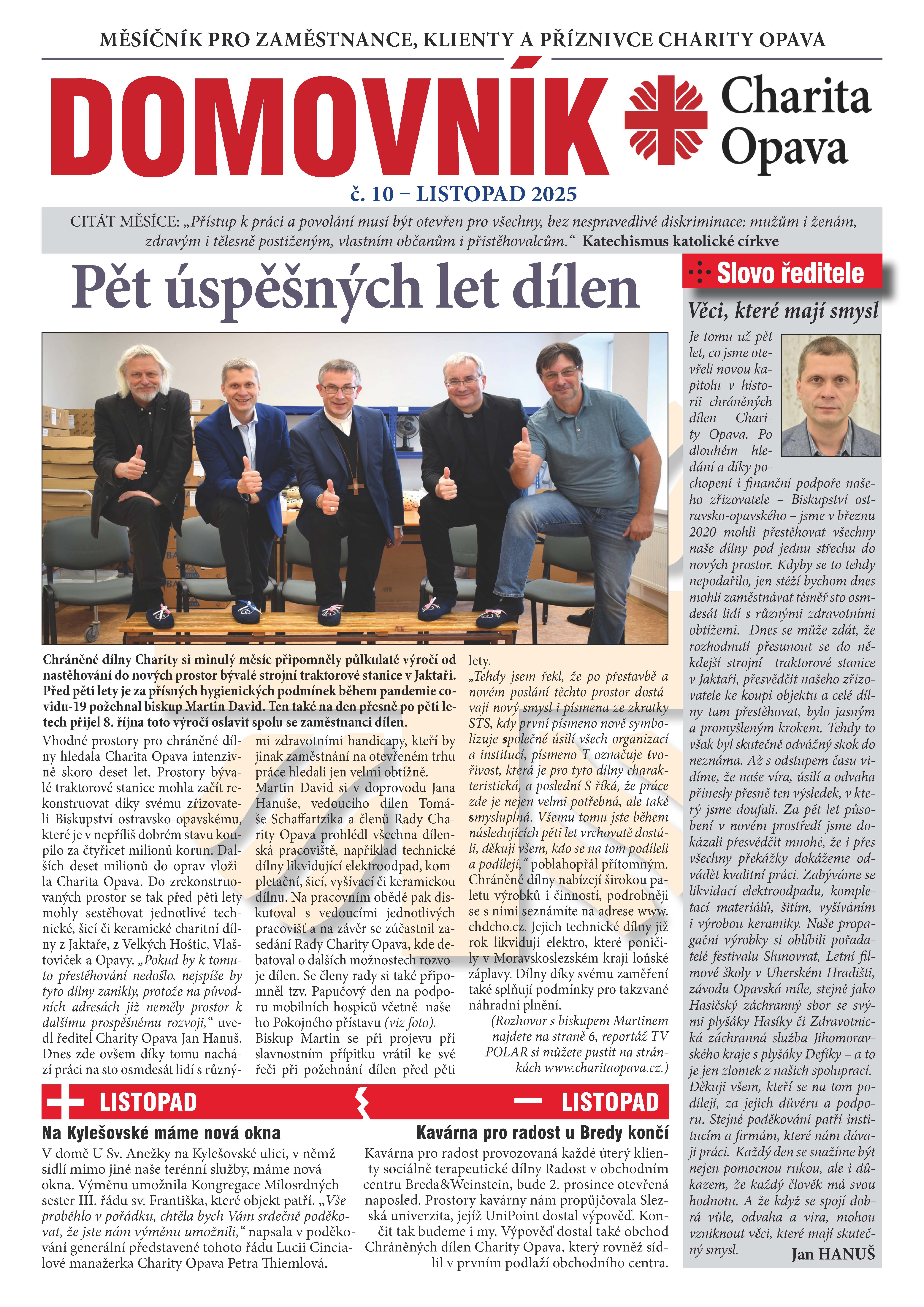 Od ničivých záplav na Opavsku uplynul v září rok. A zatímco pro lidi, které velká voda minula, se už tyto události pomalu stávají minulostí, celá řada přímo zasažených domácností se s odstraňováním následků musí potýkat dodnes. Značnou finanční pomoc jim může přinést program s názvem Živel 3. Vyhlásil ho Státní fond podpory investic a jeho cílem je finanční pomoc při obnově poškozeného obydlí, obnově zničené stavby nebo výstavbě nového obydlí.  Jak vyplývá z rozhovoru s vedoucí charitní poradny Ditou Březinovou, v opavských ulicích se začínají objevovat „povodňoví šmejdi“, kteří domácnostem nabízejí pomoc při získání dotací za úplatu, často velmi vysokou. Více v rozhovoru v týdeníku REGION OPAVSKO (8. října 2025)