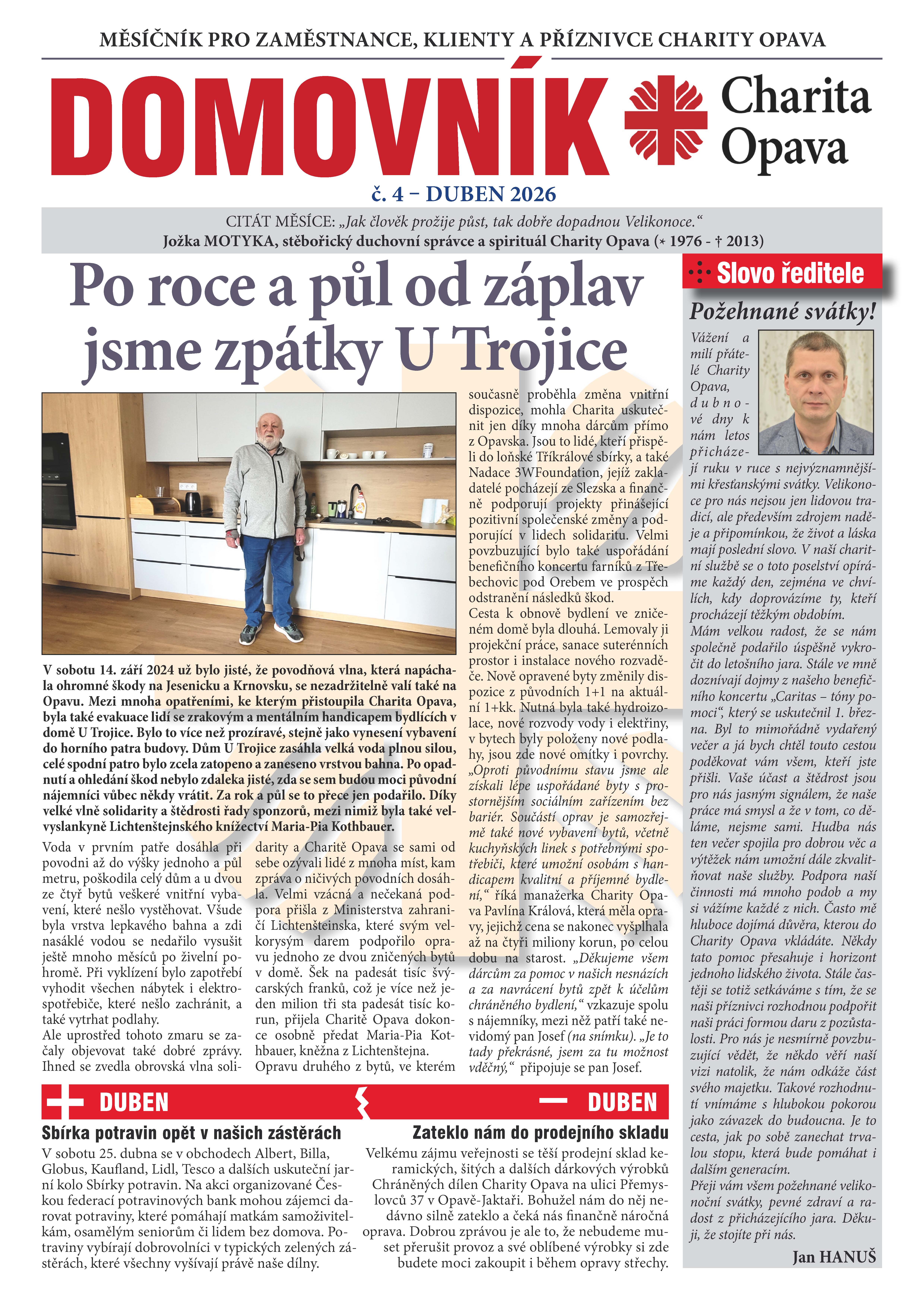 Většina seniorů si přeje zůstat co nejdéle ve vlastním známém prostředí, kde mají své vzpomínky a vazby na sousedy. (…) Na Opavsku tuto roli skvěle plní Charita Opava a další neziskové organizace, které disponují zkušeným personálem a potřebným vybavením. (…) Nedílnou součástí moderní péče v našem okrese je také paliativní a hospicová péče. Domácí hospic Pokojný přístav, který působí v rámci opavské Charity, umožňuje nevyléčitelně nemocným prožít závěr života bez bolesti a v kruhu svých nejbližších. Tato služba zahrnuje nejen zdravotní péči dostupnou 24 hodin denně, ale také psychologickou a duchovní podporu pro celou rodinu. (REGION OPAVSKO, příloha NAŠE ZDRAVÍ, 24. března 2026)