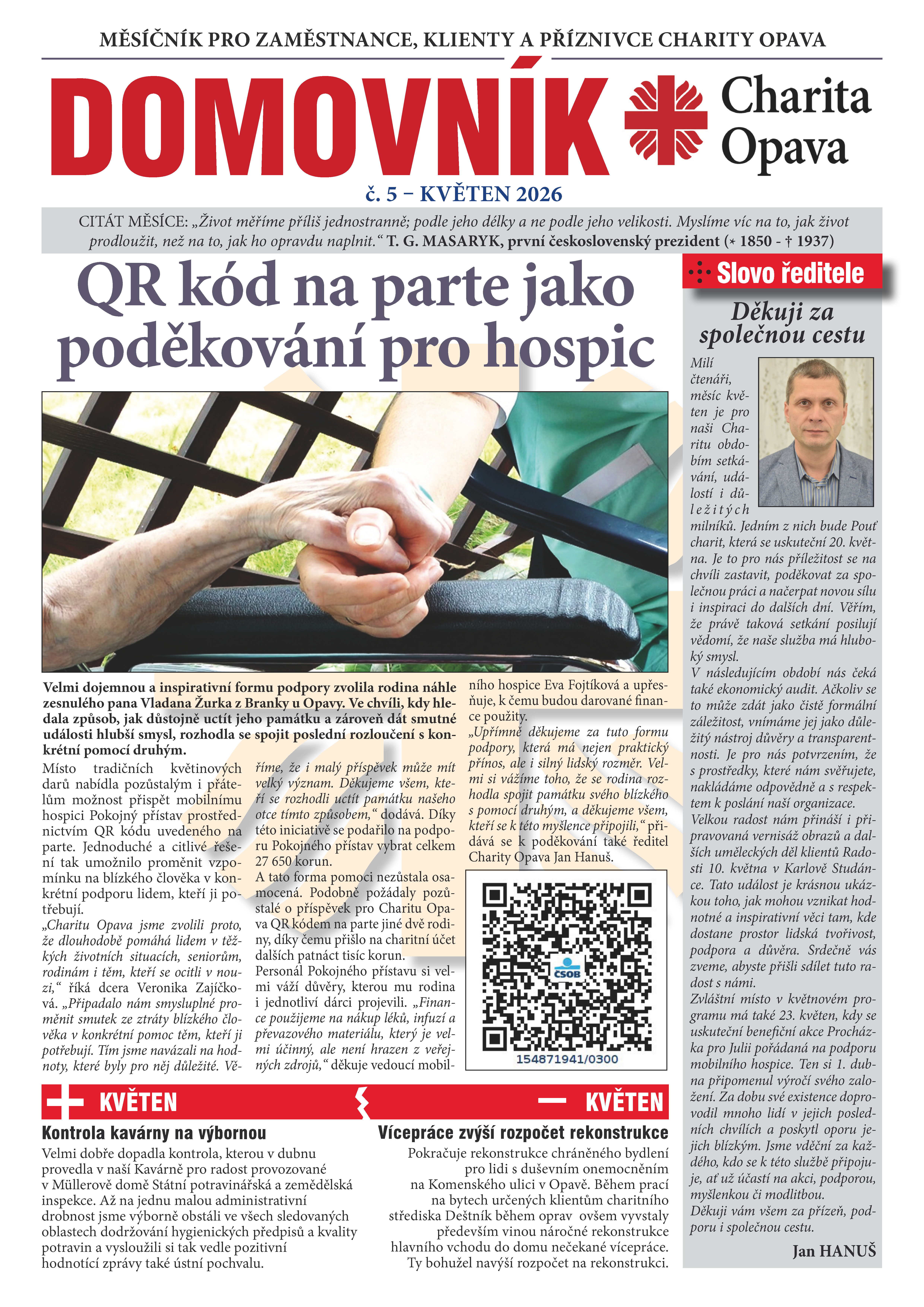 Příští rok v dubnu to bude dvacet let, co na Opavsku působí mobilní hospic Charity Opava Pokojný přístav. Jeho vysoce profesionální, ale velmi nákladnou službu, kterou zdravotní pojišťovny v řadě případů neproplácejí, by nešlo poskytovat bez podpory veřejnosti. Na nákup zdravotnických pomůcek a tišících léků často putuje část výnosu z Tříkrálové sbírky. Hospic nyní chystá benefiční procházku, jejíž výtěžek by měl umožnit nákup lineární ultrazvukové sondy. Nejen o tom jsme si povídali s lékařem Pokojného přístavu MUDr. Jakubem Segetem. (REGION OPAVSKO 28. dubna 2026)