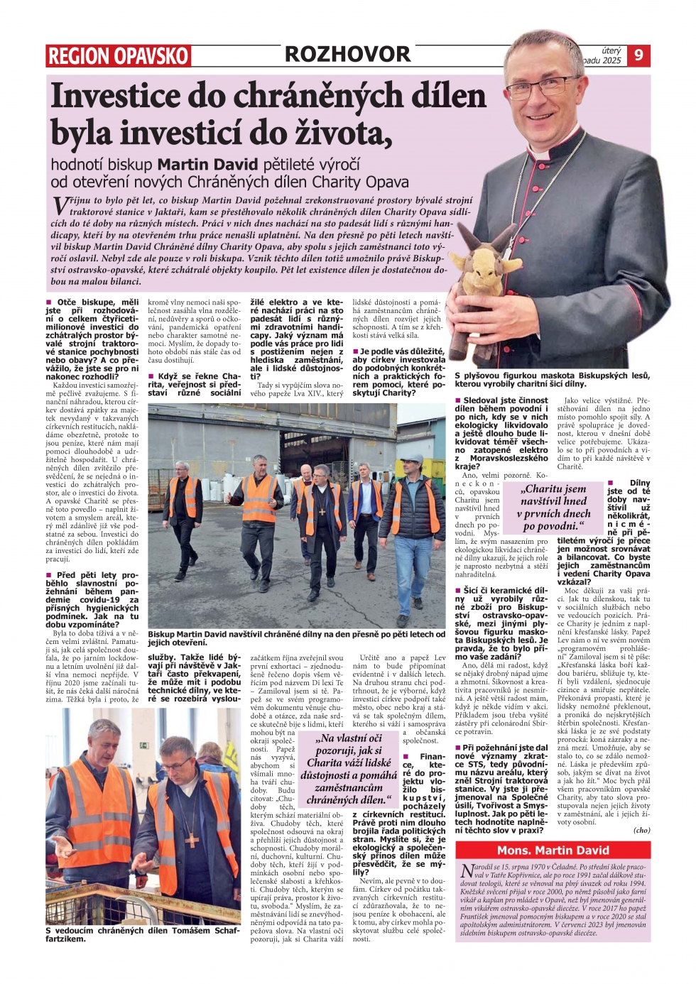 03.11.2025 - V říjnu to bylo pět let, co biskup Martin David požehnal zrekonstruované prostory bývalé strojní traktorové stanice v Jaktaři, kam se přestěhovalo několik chráněných dílen Charity Opava. Práci v nich dnes nachází na sto padesát lidí s různými handicapy. Na den přesně po pěti letech navštívil biskup Martin David Chráněné dílny Charity Opava, aby spolu s jejich zaměstnanci toto výročí oslavil. Nebyl zde ale pouze v roli biskupa. Vznik těchto dílen totiž umožnilo právě Biskupství ostravsko-opavské, které zchátralé objekty koupilo. Pět let existence dílen je dostatečnou dobou na malou bilanci. Úvod k rozhovoru s biskupem Martinem Davidem v týdeníku REGION OPAVSKO, celý ho najdete po rozkliknutí. (4. listopadu 2025)