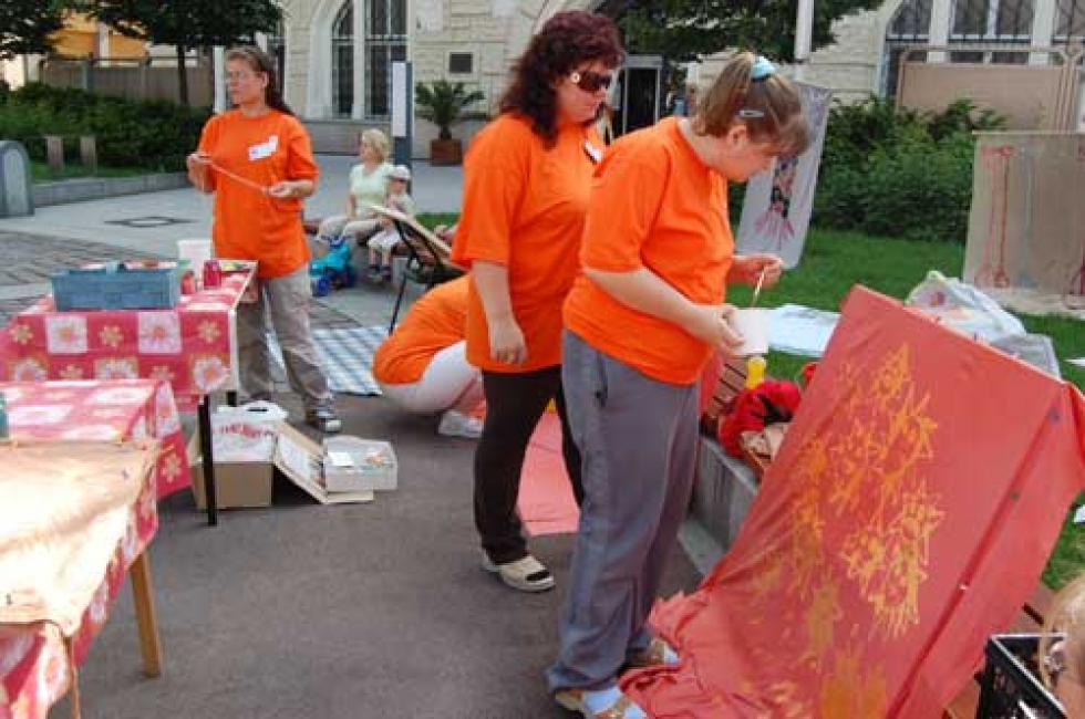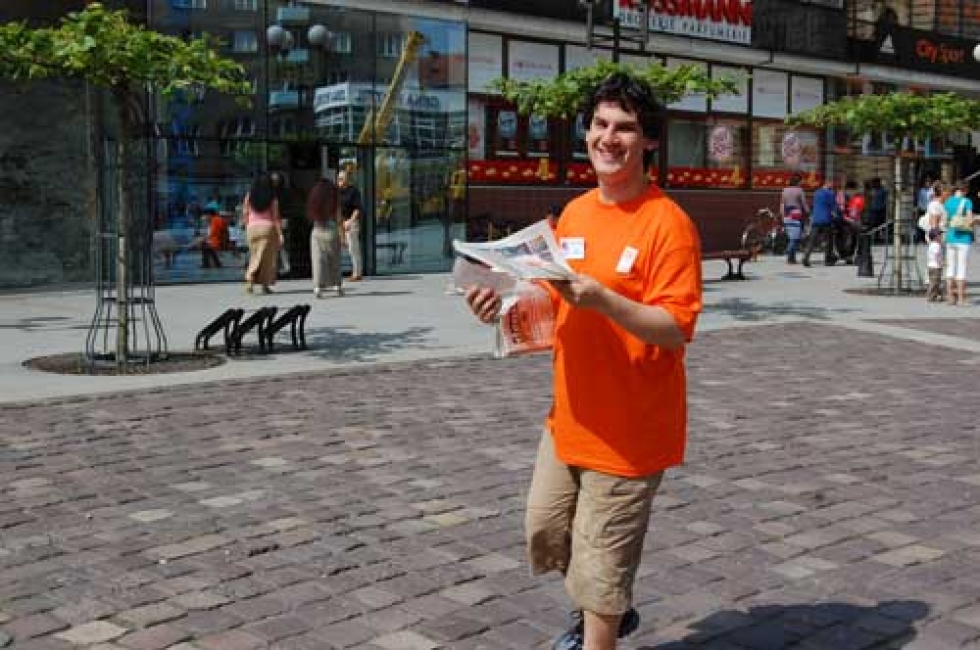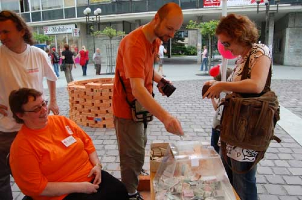 Během celého dne můžete na náměstí potkat lidi oblečené do oranžových triček, to jsou zaměstnanci a klienti rehabilitačních dílen, kteří vám nabízejí letáky Akce cihla a také zadarmo noviny Deník.