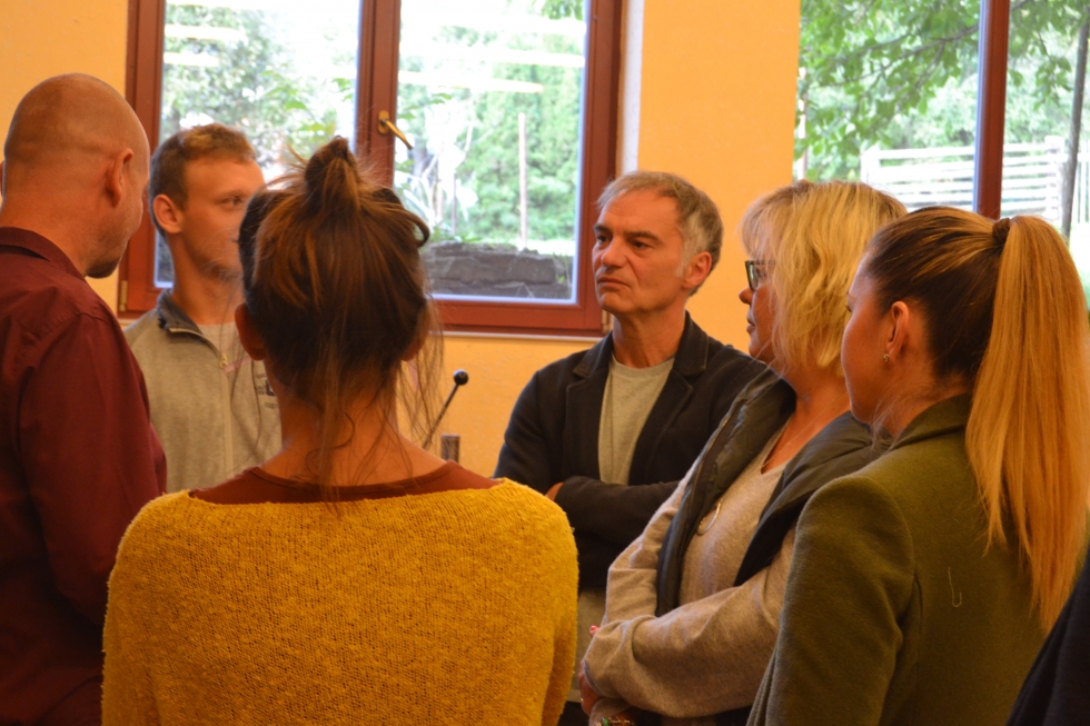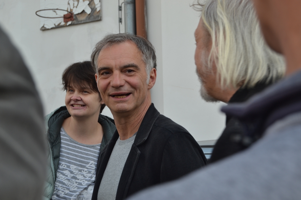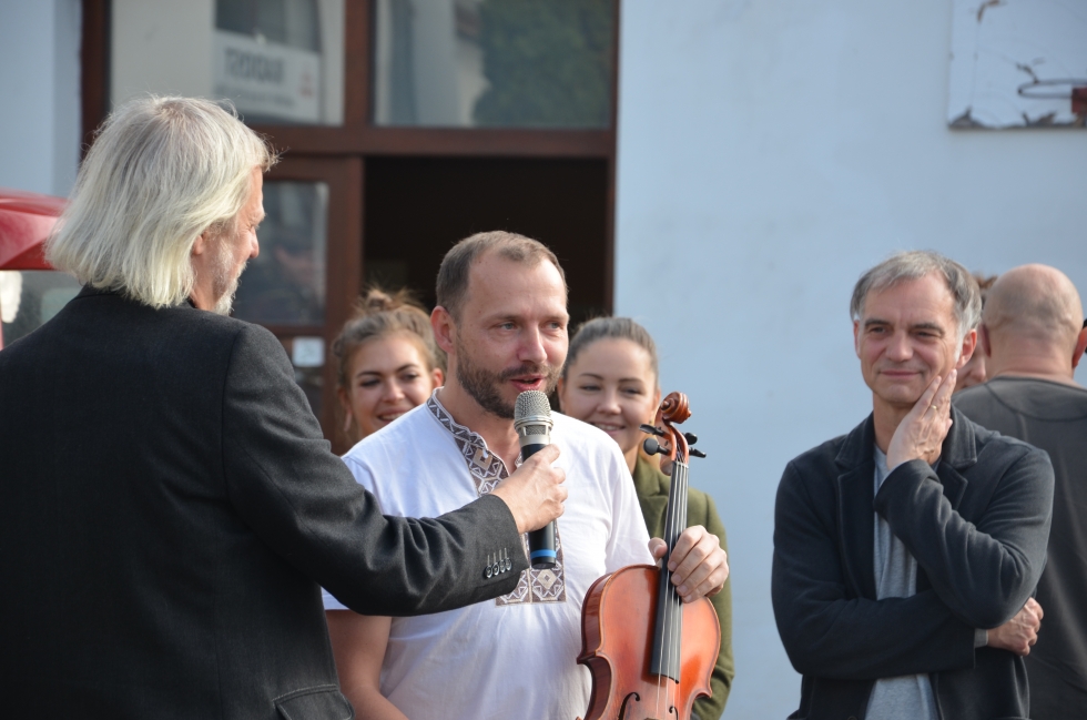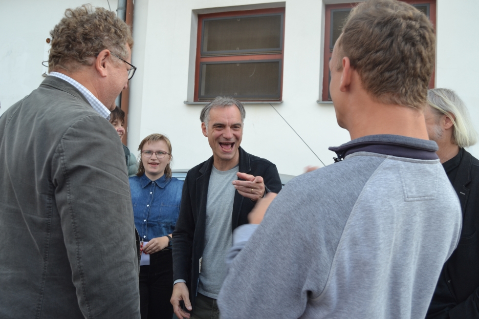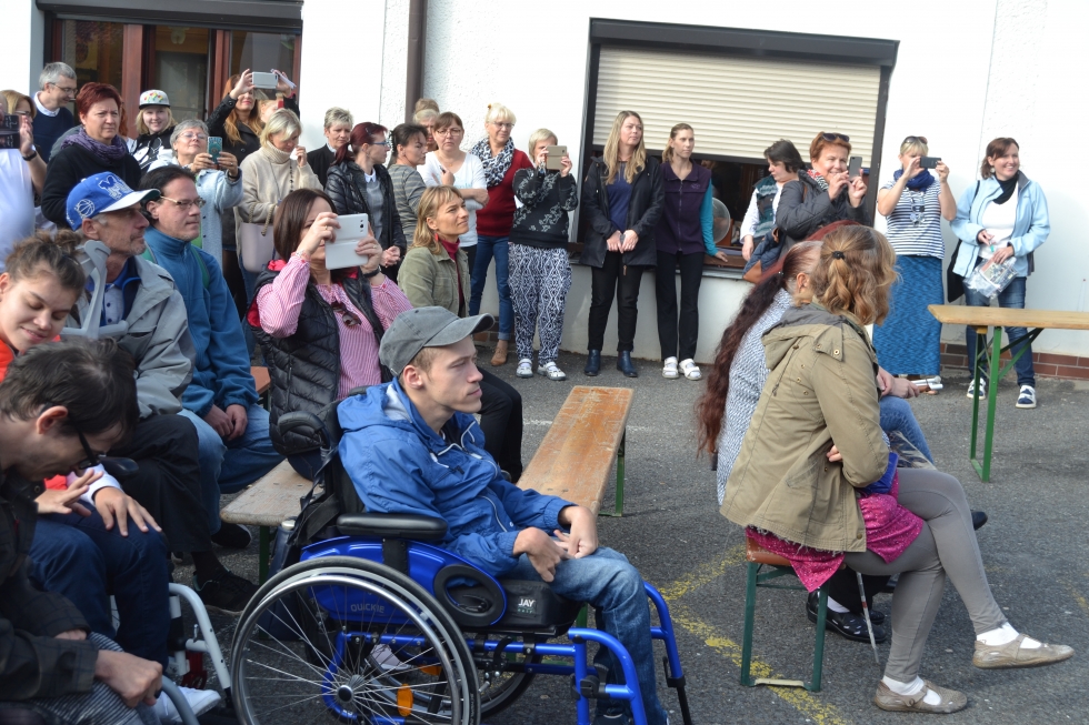 Mezitím se již na dvoře shromáždilo asi sto zaměstnanců a klientů z dalších středisek Charity Opava. Ivan Trojan jim odpověděl na několik otázek a povyprávěl o tom, zda se bude natáčet třetí pokračování filmu Anděl Páně, nebo jak se seznámil s trenérem opavských basketbalistů Petrem Czudkem, který se na vizitu Dejvického divadla v Charitě Opava přišel podívat i s manželkou. Jak můžete vidět na videu, Ivan Trojan se během svého improvizovaném vystoupení krom jiného bravurně zvládnul vypořádat s hlasitě štěkajícím psem.