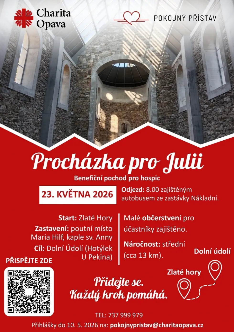 Účastníci benefiční procházky, mezi nimiž budou také Juliina rodina i tým Pokojného přístavu, odjedou v sobotu 23. května v osm hodin ráno připraveným autobusem ze zastávky Nákladní. Po příjezdu do Zlatých Hor se vydají na zhruba třináctikilometrovou trasu se zastávkou na poutním místě Maria Hilf, aby posléze pokračovali do Dolního údolí. Závěr procházky je plánovaný v restauraci U Pekina, odkud bude zajištěn návrat autobusem zpět. Přihlášky je možno podávat do 10. května na e-mail pokojnypristav@charitaopava.cz nebo telefonicky na čísle 737 999 979.