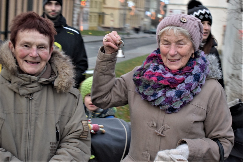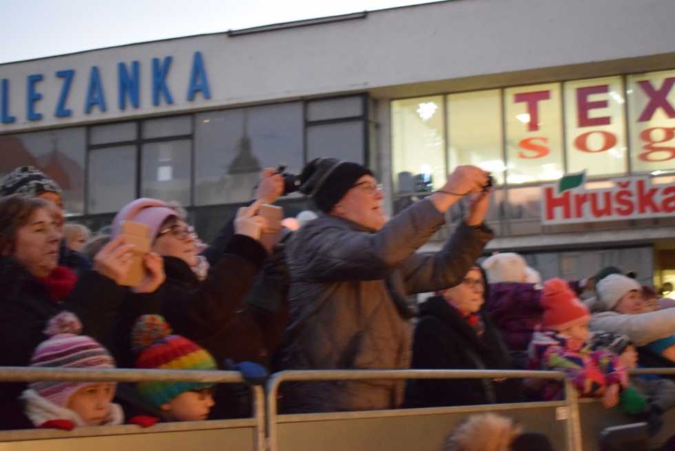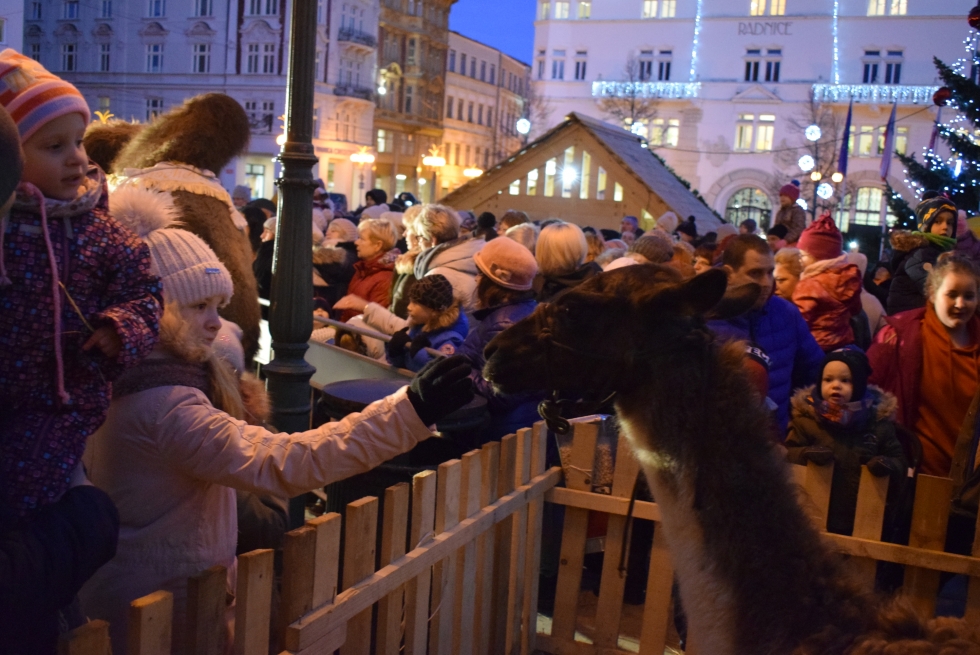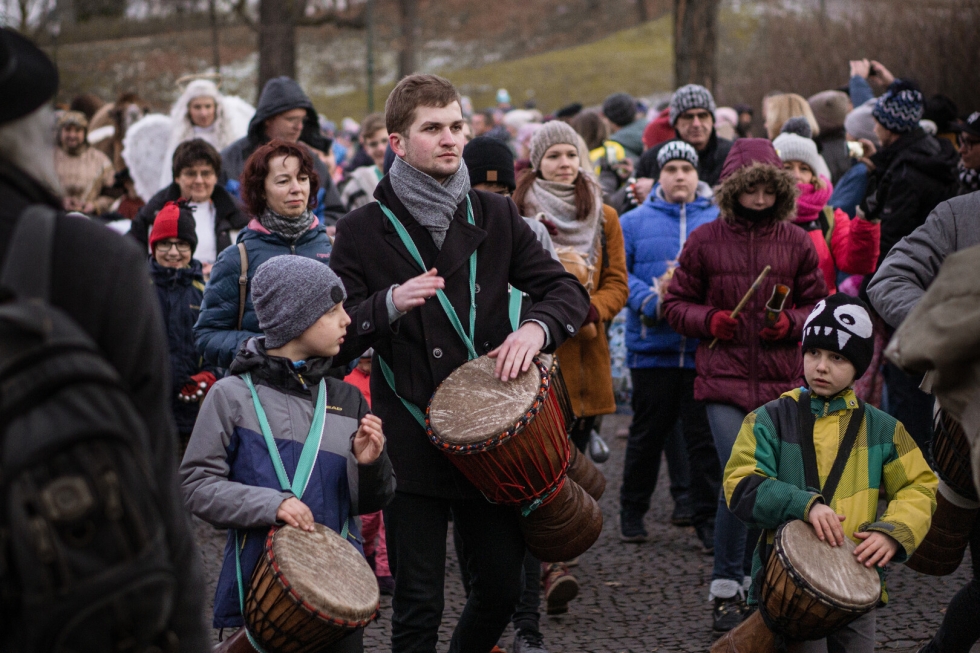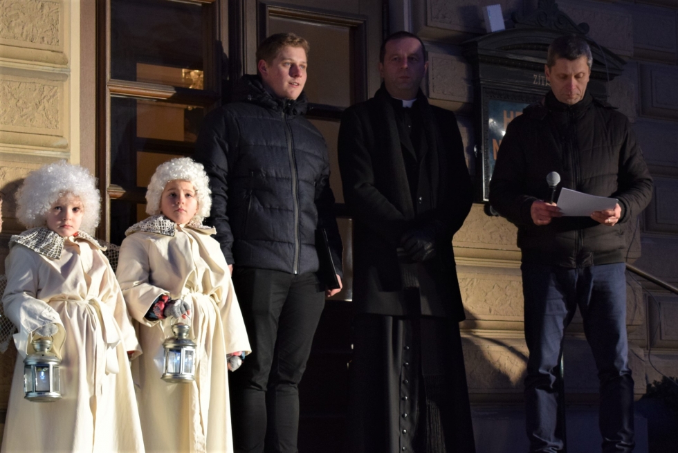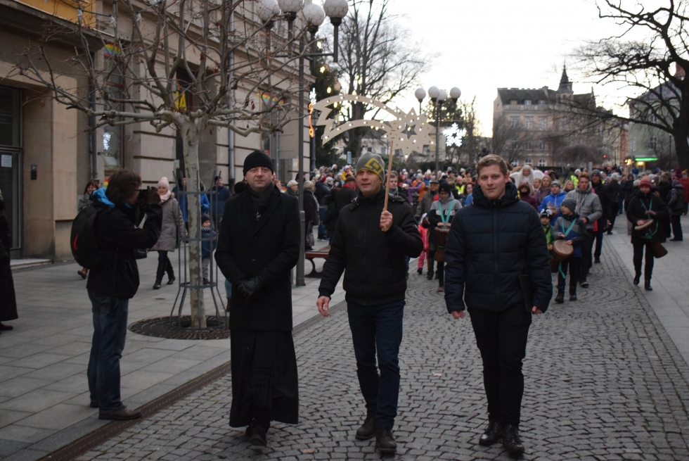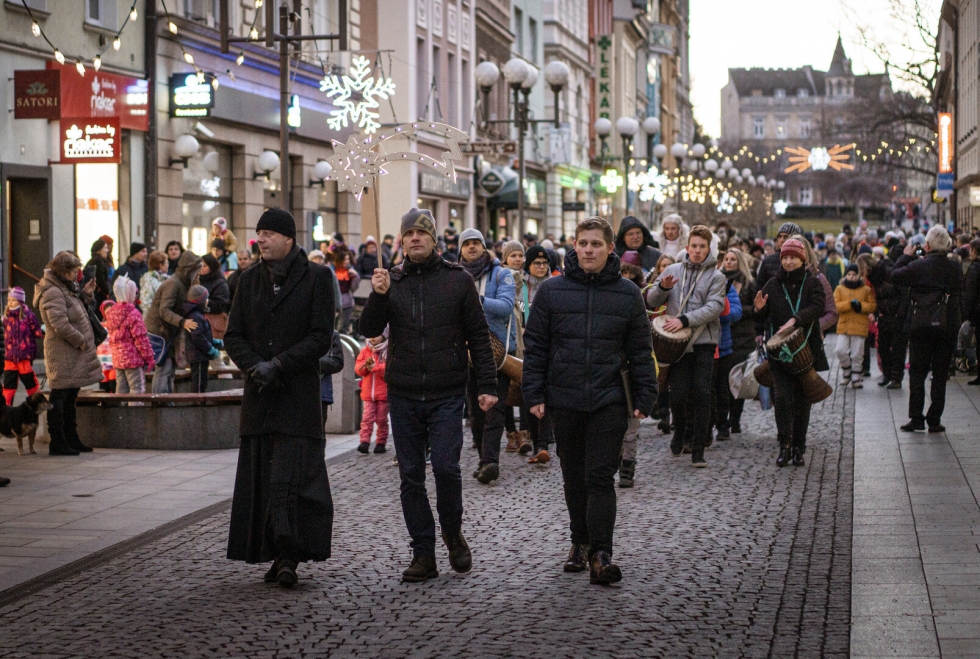 A poté, co zapíval pěvecký sbor Domino, už začal rytmicky do kroku hrát bubenický orchestr Boris a proud lidí, kteří chtějí být nápomocni svým blízkým, pokračoval na Horní náměstí. „Lidová moudrost praví – Bez Božího požehnání marné lidské namáhání,“ požádal pak před jesličkami na schodech Slezského divadla o požehnání koledníkům Jan Hanuš opavského děkana Jana Czudka..
