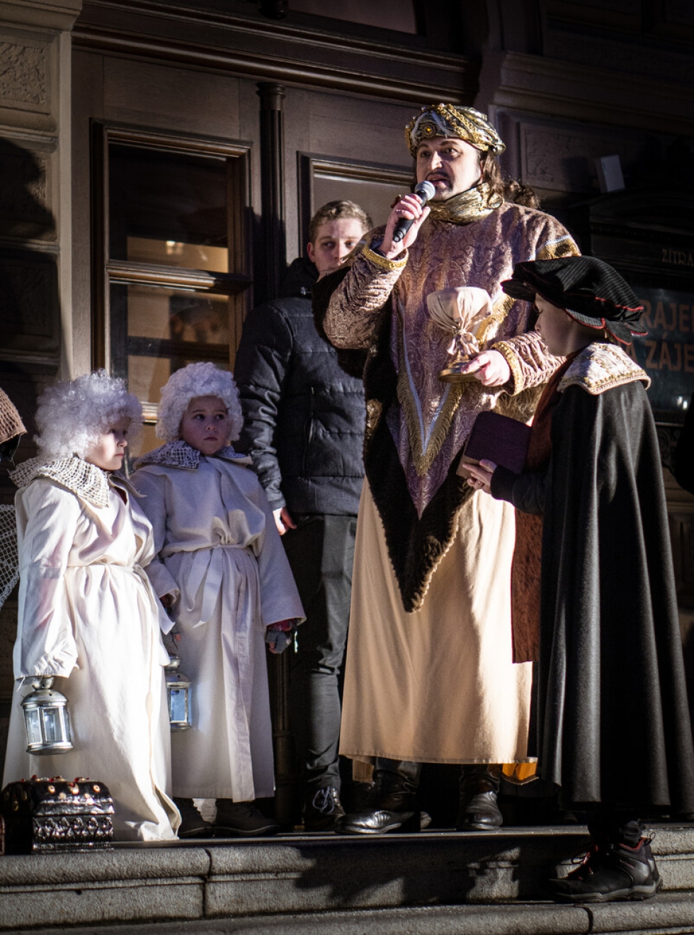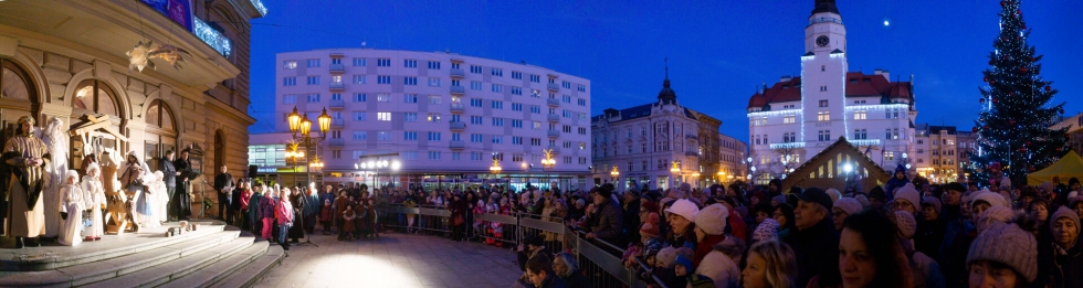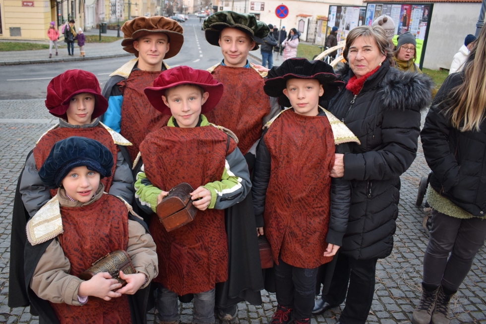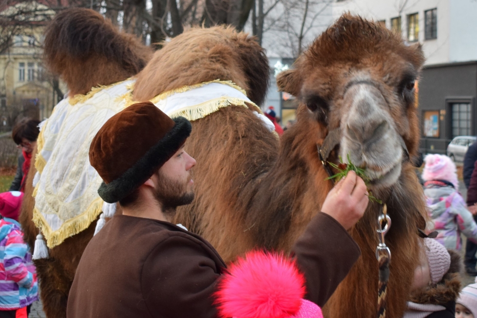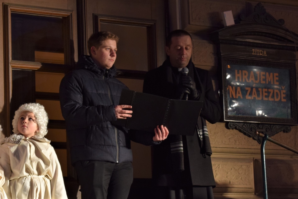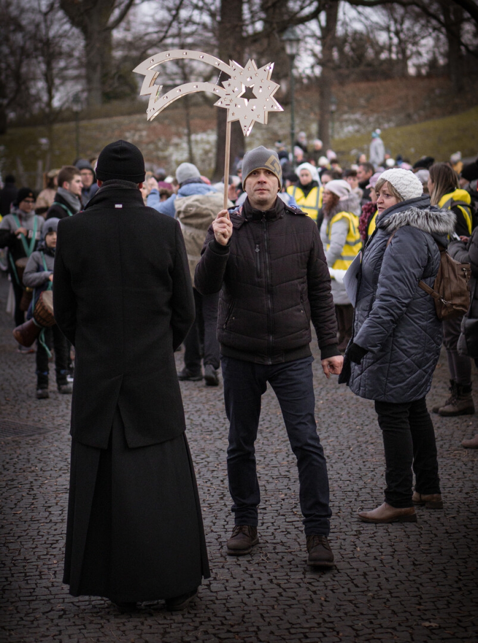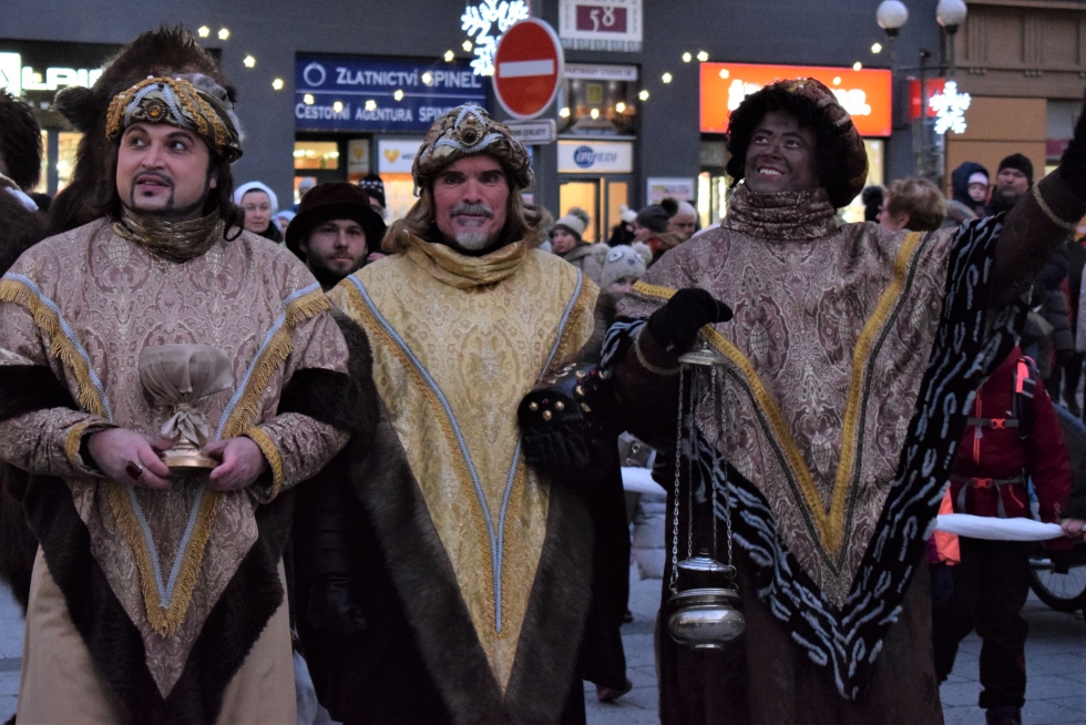A poté, co zapíval pěvecký sbor Domino, už začal rytmicky do kroku hrát bubenický orchestr Boris a proud lidí, kteří chtějí být nápomocni svým blízkým, pokračoval na Horní náměstí. „Lidová moudrost praví – Bez Božího požehnání marné lidské namáhání,“ požádal pak před jesličkami na schodech Slezského divadla o požehnání koledníkům Jan Hanuš opavského děkana Jana Czudka..