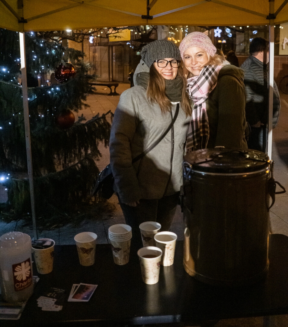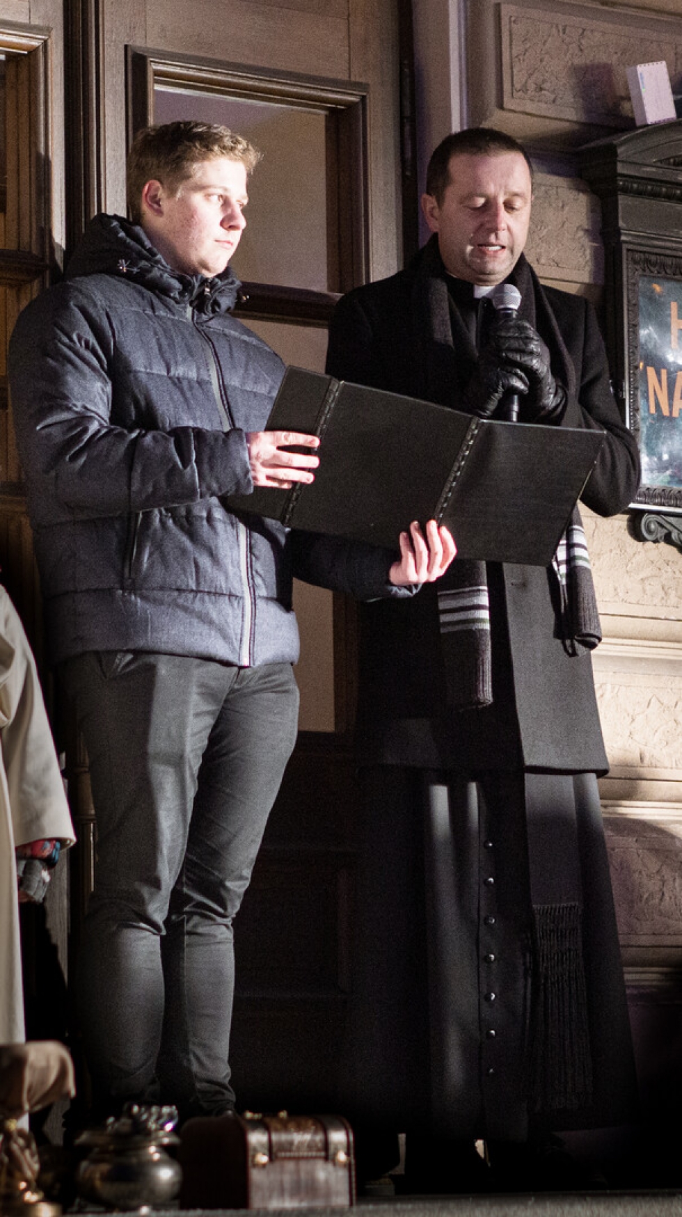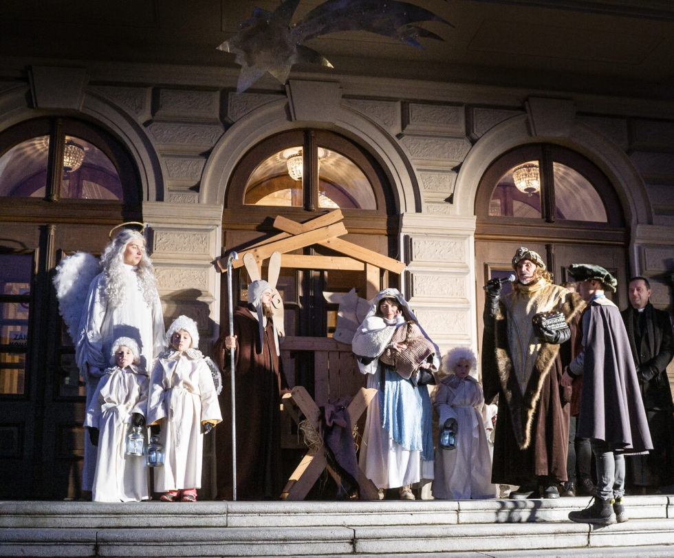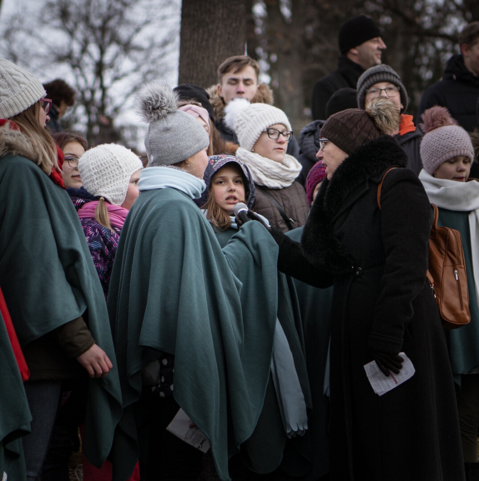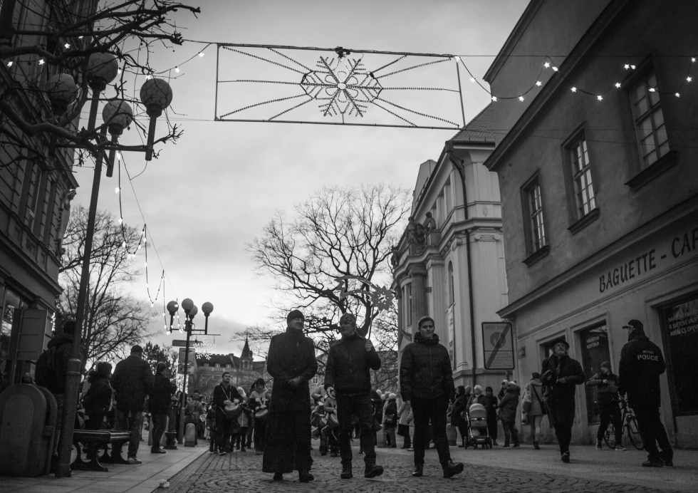 A poté, co zapíval pěvecký sbor Domino, už začal rytmicky do kroku hrát bubenický orchestr Boris a proud lidí, kteří chtějí být nápomocni svým blízkým, pokračoval na Horní náměstí. „Lidová moudrost praví – Bez Božího požehnání marné lidské namáhání,“ požádal pak před jesličkami na schodech Slezského divadla o požehnání koledníkům Jan Hanuš opavského děkana Jana Czudka..