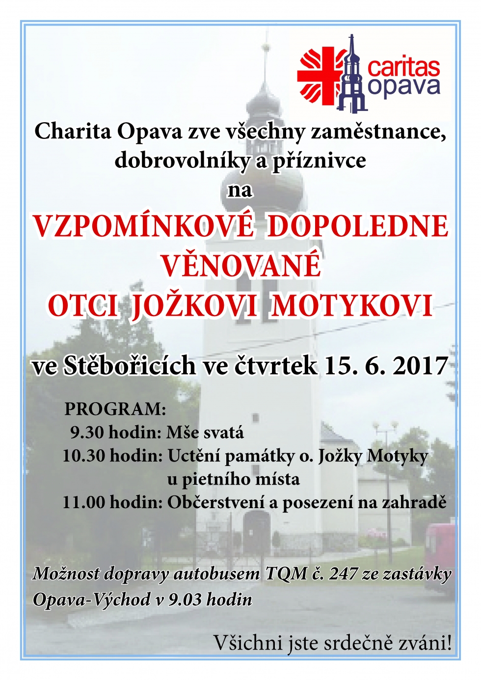 Ve čtvrtek 15. června na skromnějším a spíše rodinném setkání na svého otce Jožku zavzpomínají zaměstnanci, klienti a příznivci Charity Opava spolu se stěbořickými farníky. Účastníci piety budou moci tak jako v předchozích letech do Stěbořic dorazit buď auty či autobusy, nebo si, pokud to dovolí počasí, udělat do Stěbořic z Opavy krásnou procházku.Na místě již bude připraven program - v 9.30 hodin bude ve stěbořickém chrámu Narození Panny Marie sloužit mši svatou otec Klement Rečlo, posléze v 10.30 hodin u pietního místa v nově zrekonstruovaném parčíku vedle kostela na otce Jožku zavzpomínáme s písničkou a zapálíme svíčky na jeho památku. No a pak už bude následovat méně formální posezení na faře a farské zahradě, samozřejmě s občerstvením.