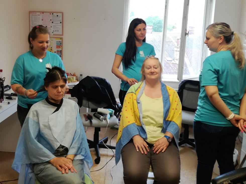 Zákazníci do improvizovaného salóny krásy dorazili ze třech středisek. Jirka a Marie přišli z Chráněného a podporovaného bydlení pro duševně nemocné, Katka a Ivana ze sociálně terapeutické dílny Radost a z Vlaštoviček přijela Hanka.