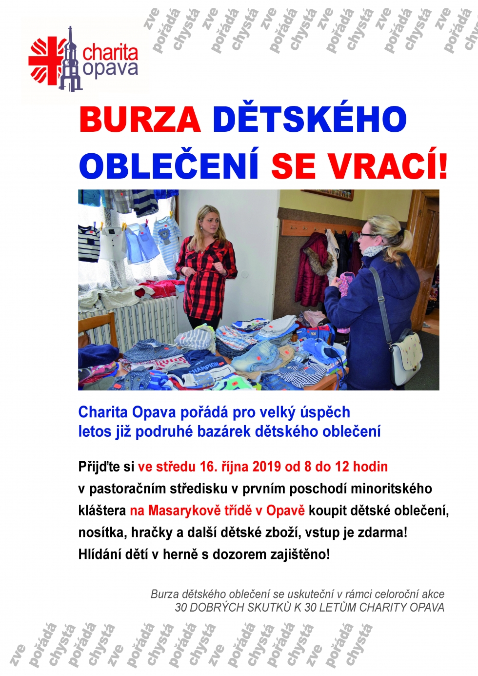 Burzu dětského oblečení pořádalo před lety pravidelně středisko Charity Opava Neškola, po jeho zániku ale skončily i mezi maminkami velmi oblíbené bazárky. Letos v březnu se Charita Opava rozhodla uspořádat jednorázovou burzu dětského oblečení v rámci celoročního připomínání kulatého výročí svého vzniku pod názvem „30 dobrých skutků k 30 letům Charity Opava“. „Pro velký zájem jsme se rozhodli ji ještě jednou zopakovat,“ říká bývalá vedoucí NEŠKOLY Svatava Bláhová. „V případě zájmu o prodejní místo zasílejte objednávky na e-mail blahova@charitaopava.cz,“ dodává.