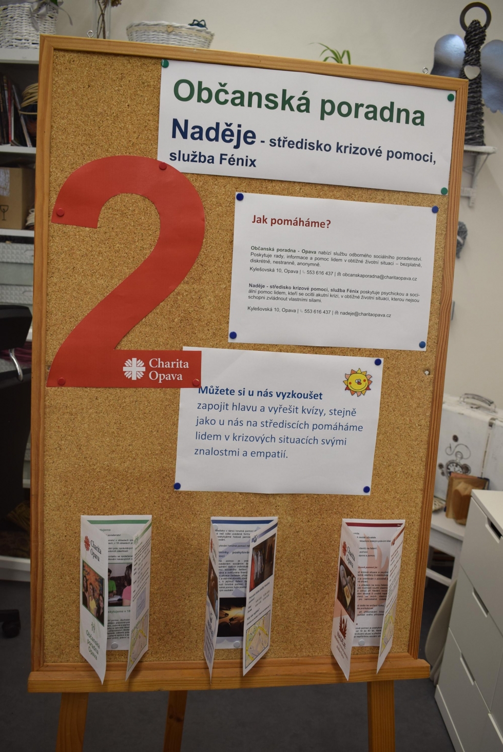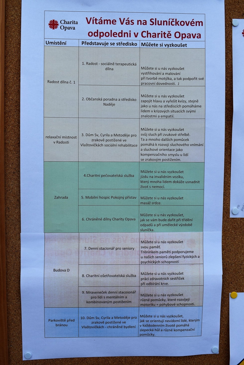 Činnost jednotlivých charitních středisek přiblížilo soutěžícím dětem celkem deset stanovišť. Na stanovišti sociálně terapeutické dílny Radost měly děti za úkol vystřihnout a namalovat motýlka, Občanská poradna připravila řešení kvízů, Dům sv. Cyrila a Metoděje přichystal atraktivní zvukovou střelbu a chůzi se zakrytýma očima a slepeckou holí. Na stanovišti pečovatelské služby si mohly děti vyzkoušet jízdu na invalidním vozíku, u mobilního hospice Pokojný přístav masáž srdce a práci zdravotních sestřiček při odebírání krve jim přiblížilo stanoviště Charitní ošetřovatelské služby. Chráněné dílny připravily soutěž v separování odpadu, Mraveneček nabídl vyzkoušení pomůcek rozvíjejících jemnou motoriku a Denní stacionář pro seniory procvičil paměť soutěžících.