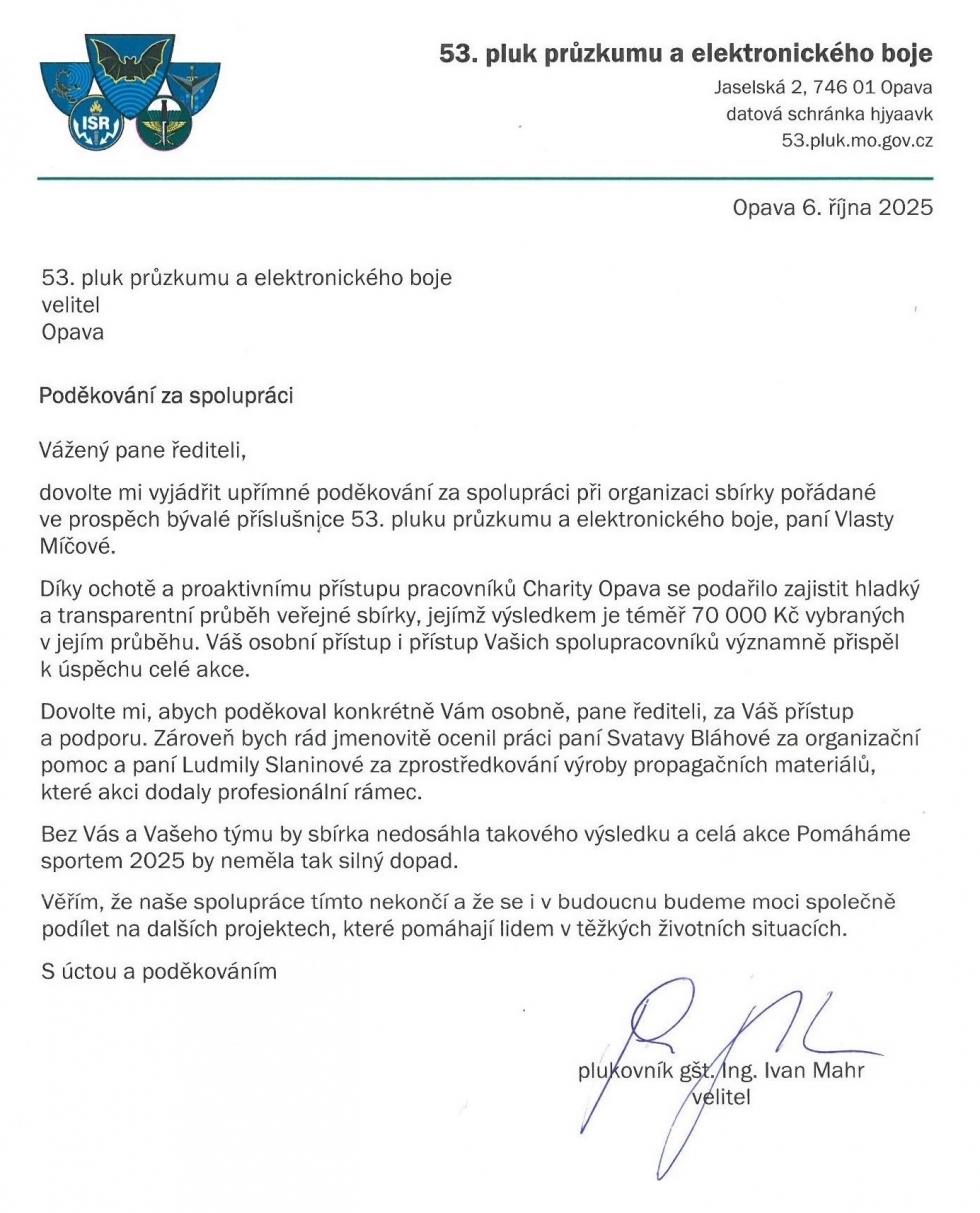 Dovolte mi vyjádřit upřímné poděkování při organizaci sbírky pořádané ve prospěch bývalé příslušnice 53. pluku průzkumu a elektronického boje, paní Vlasty Míčové. Díky ochotě a proaktivnímu přístupu pracovníků Charity Opava se podařilo zajistit hladký a transparentní průběh veřejné sbírky, jejímž výsledkem je téměř 70 000 Kč vybraných v jejím průběhu. Z dopisu plukovníka gšt. Ing. Ivana MAHRA, celý text najdete po kliknutí na odkaz níže. (15. října 2025)