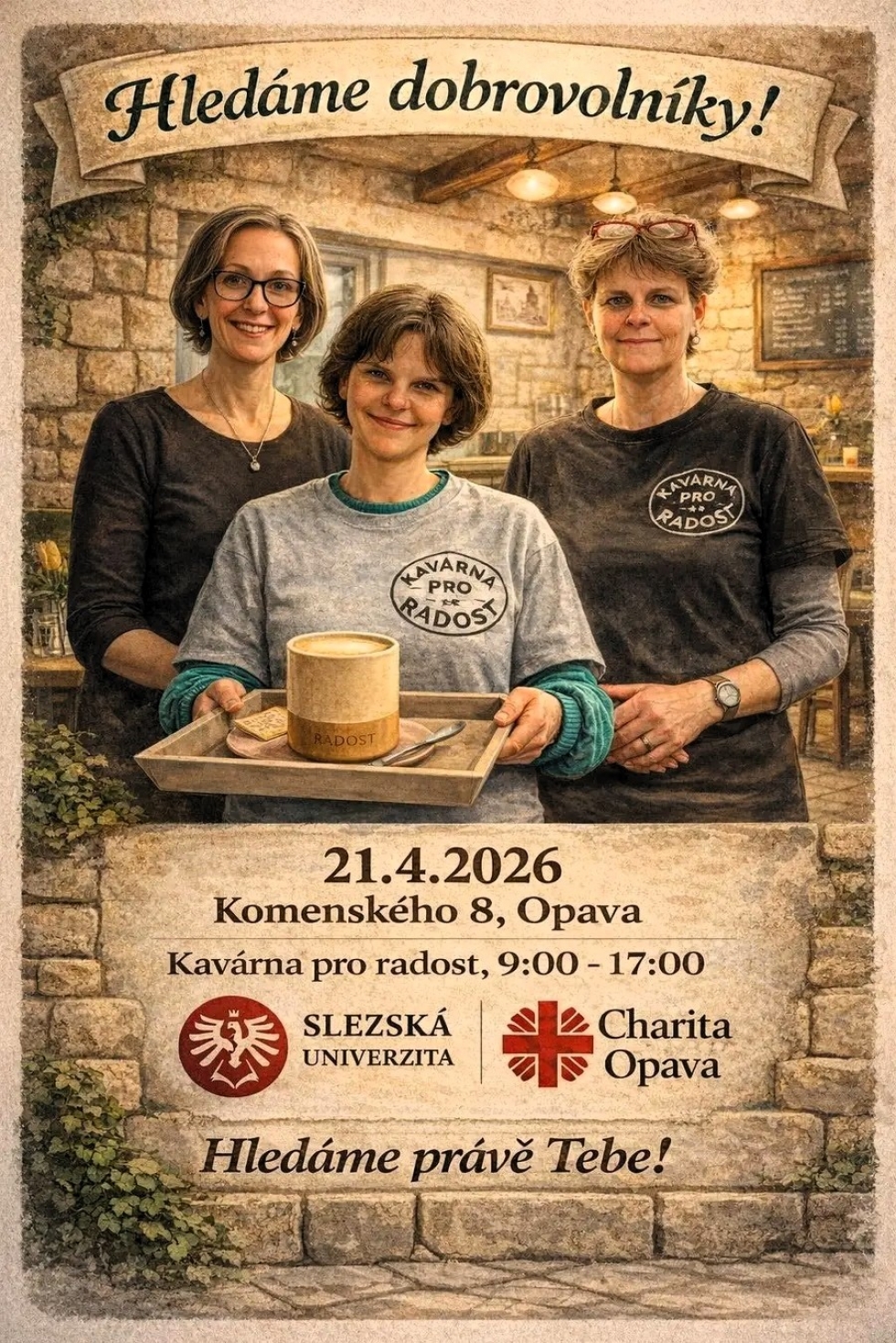 17.04.2026 - Dobrovolníky hledá do své kavárny v Müllerově domě sociálně terapeutická dílna Radost. Kavárna pro radost, ve které obsluhují klienti tohoto střediska Charity Opava, je zde otevřena každé úterý od 9 do 17 hodin. Oslovení dobrovolníků organizuje Radost ve spolupráci se Slezskou univerzitou v Opavě v rámci Dnů dobrovolnictví, které v České republice probíhají od 20. do 26. dubna.