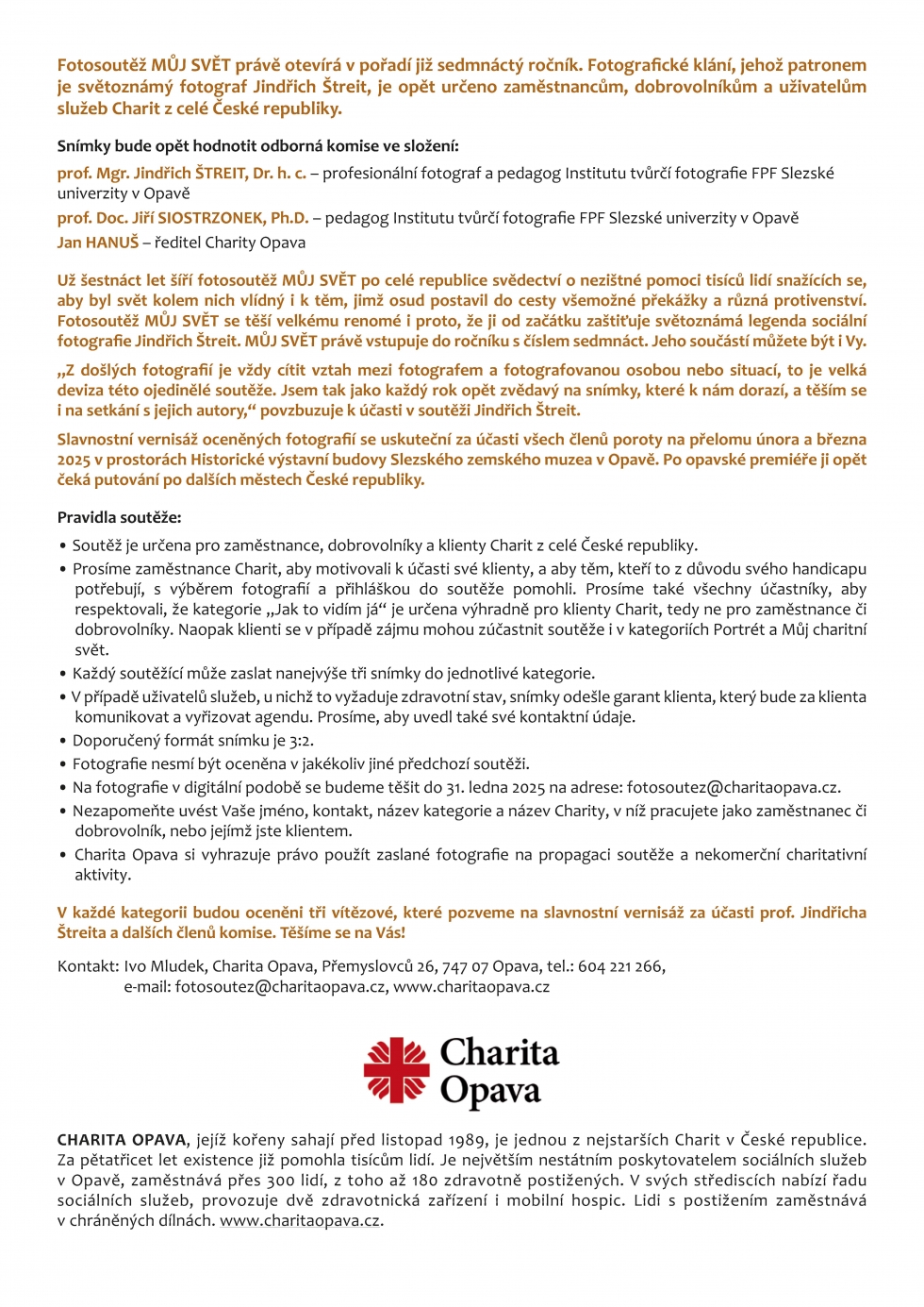 Fotosoutěž MŮJ SVĚT pořádá Charita Opava pro zaměstnance, dobrovolníky a klienty Charit z celé České republiky. Ti mají možnost poslat své snímky do tří kategorií s názvem Portrét, Můj charitní svět a Jak to vidím já. Kategorie jak to vidím já je určena výhradně uživatelům služeb Charity. Tito klienti se ale v případě zájmu mohou zúčastnit soutěže ve všech třech kategoriích. Loni například získal první místo v kategorii Portrét klient Stacionáře Úsměv z Třebíče David Treger.