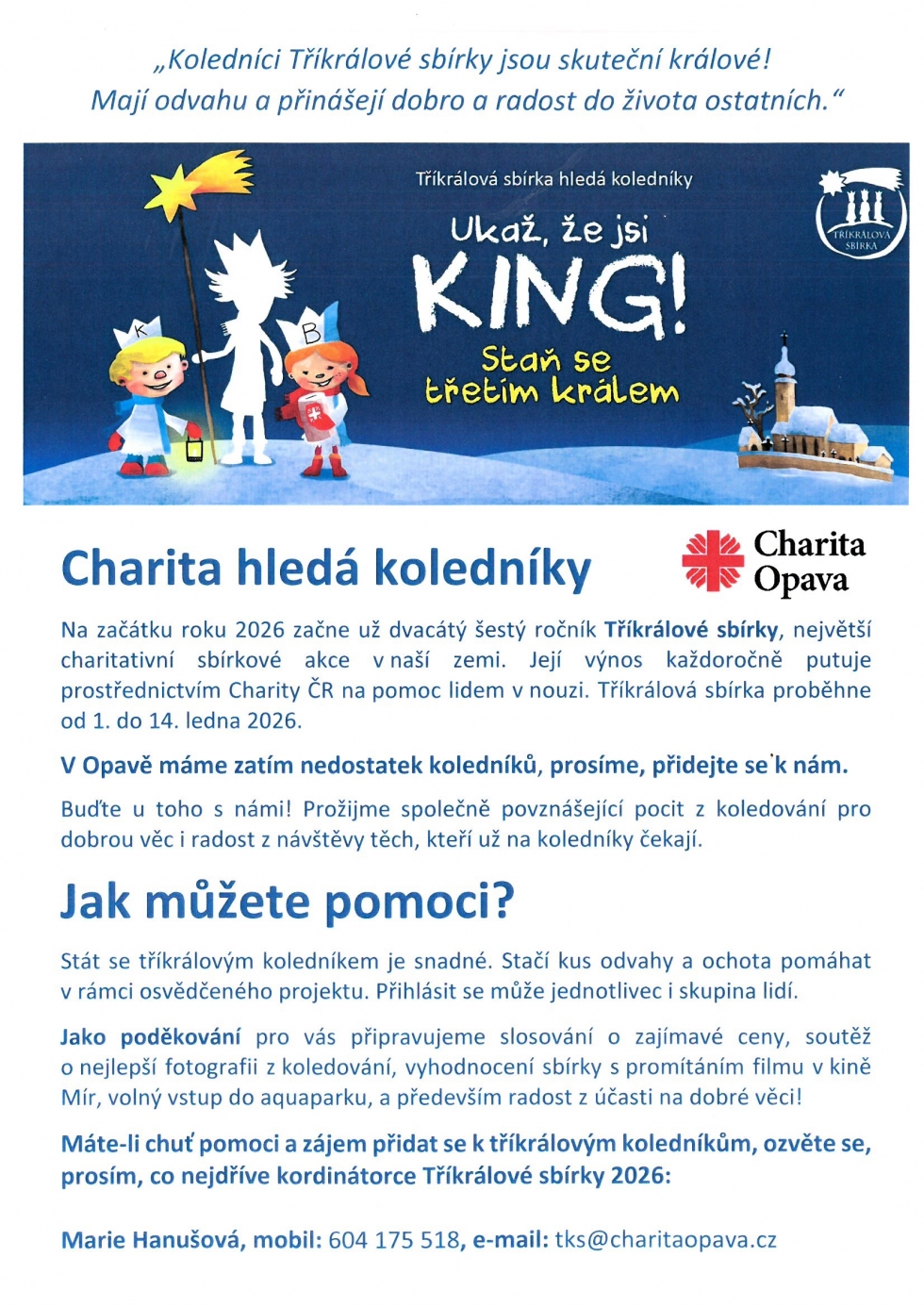 Za každého koledníka budeme moc rádi. Zájemci o koledování z řad jednotlivců i celé skupinky se mohou již nyní hlásit u koordinátorky Tříkrálové sbírky na Opavsku Marie Hanušové na e-mailové adrese tks@charitaopava.cz nebo na telefonu 604 175 518. „Při koledování se dá zažít hodně pěkných chvilek, a navíc je hezké začít nový rok dobrým skutkem. Připojte se k nám, přijďte si užít radost z koledování, šířit poselství Tří králů a přispět k dobré věci,“ vzkazuje Marie Hanušová.