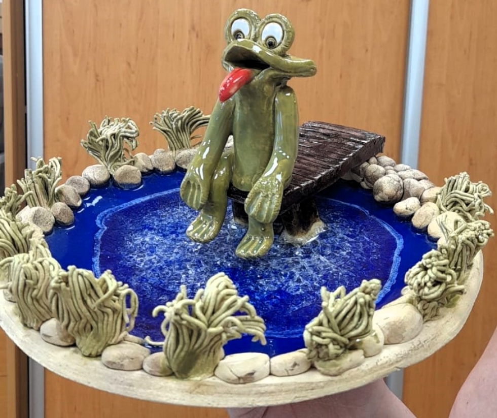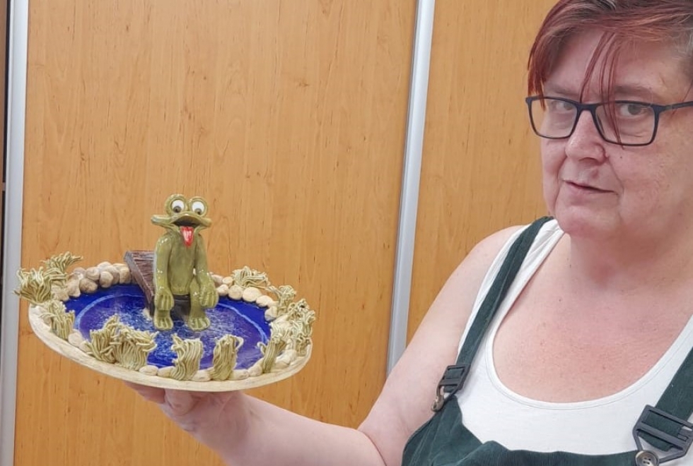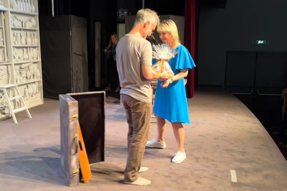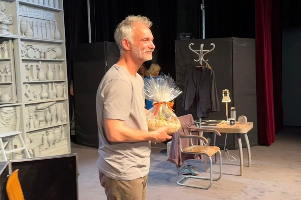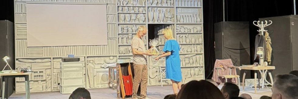 24.05.2024 - Originální keramickou sošku žáby v rybníku vyrobenou v Chráněných dílnách Charity Opava dostal ve středu 22. května darem při děkovačce po vystoupení v opavském kině Mír herec Ivan Trojan. Trojan totiž v Opavě krátce po pražské premiéře představil monodrama Žáby, které pro něj napsal u příležitosti jeho životního jubilea dvorní autor Petr Zelenka. Sošku Ivanu Trojanovi na jevišti předala vedoucí dílenského marketingu Ludmila Slaninová.