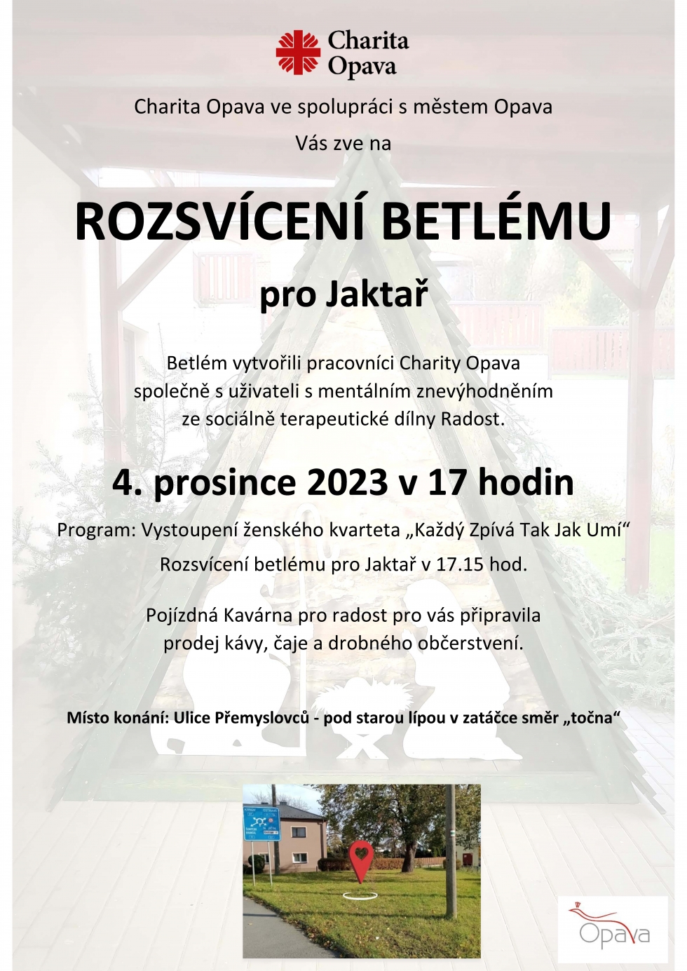 Na základě žádostí občanů Jaktaře o vánoční výzdobu se Hláska obrátila na Charitu Opava. „Chtěli jsme oslovit některou z místních firem či organizací, a Charita Opava má v Jaktaři své ředitelství,“ vysvětluje vedoucí odboru opavského primátora Jana Foltýsová. A tak se nakonec do výroby originálního betlému, kterou zafinancovalo město Opava, pustili zaměstnanci a především klienti Charity Opava.
