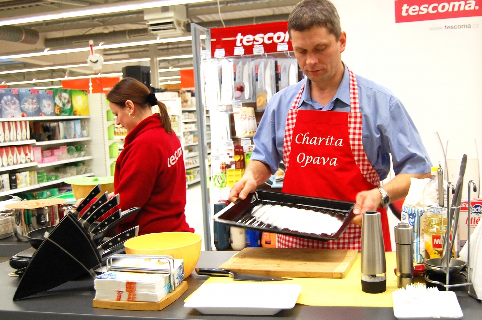V slušivé zástěře, kterou mu těsně před akcí na míru ušily a vyšily švadlenky šicí dílny Chráněných dílen sv. Josefa, si ředitel před zraky tolika lidí začal připravovat ingredience a později si pochvaloval, že měl k ruce dva zkušené pomocníky z TESCOMA PROMO TEAMU.