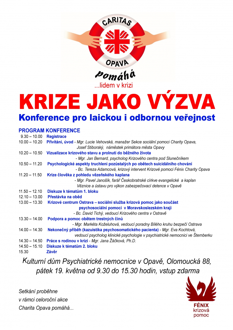 Více než sto lidí sedí se zavřenýma očima v naprosté tichosti ve zcela zaplněném sále kulturního domu Psychiatrické nemocnice v Opavě. Podle instrukcí přednášejícího si představují, že se právě nacházejí na místě, kde jim v životě vždy bylo dobře, pak se pomalu vydávají na příjemnou cestu, na jejímž konci je čeká něco velmi krásného. A najednou se před nimi objeví zeď. Zeď, která se nedá ani přelézt, ani obejít, a která je tak navždy oddělí od vysněného cíle. Takto psycholog Jan Bernard v prvním příspěvku otevřel konferenci, kterou pod názvem „Krize jako výzva“ uspořádala v pátek 19. května služba krizové pomoci Fénix Charity Opava.