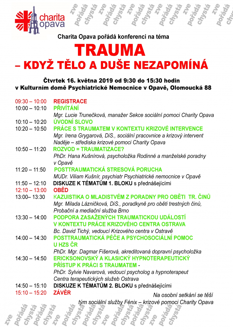 29.04.2019 - Konference na téma „Trauma - když tělo a duše nezapomíná“, kterou ve čtvrtek 16. května pořádá v kulturním domě Psychiatrické nemocnice v Opavě služba krizové pomoci Charity Opava Fénix, je již plně obsazena.