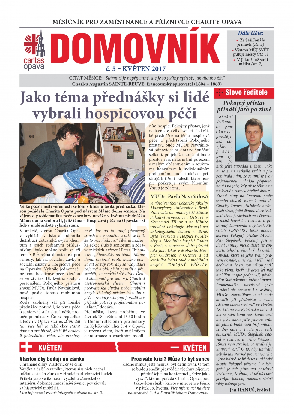 27.04.2017 - Krizovým situacím se v životě nevyhne žádný z nás. A ačkoli je vnímáme jako výrazně negativní jev, nabídne Charita Opava v květnu na krizi trochu jiný pohled. Krize totiž může být také novým začátkem, výzvou ke změně. I o tom se dočtete v nejnovějším vydání Domovníku.