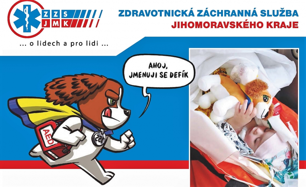 Tváří této aktivity Zdravotnické záchranné služby Jihomoravského kraje se stal herec Saša Rašilov, kterého můžete vidět na fotografii s velkým maskotem, psem Defíkem, vyrobeným v Chráněných dílnách Charity Opava.