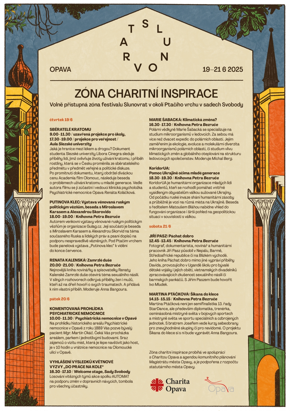I když volně přístupná část festivalu nabízí velmi atraktivní program, na Slunovrat se vyplatí zakoupit vstupenku. Festival totiž do Opavy přiveze legendy rockové hudební historie, současné hvězdy i budoucí naděje a nabídne besedy s řadou inspirativních osobností, novou vědeckou scénu v kostele sv. Janů i pouliční cirkus. Vyjmenovat vše, co pořadatelé připravili pro letošní dvanáctý ročník, zde není možné. Podrobný program najdete na webových stránkách a sociálních sítích Slunovratu, rychlou a přehlednou orientaci umožní také festivalová aplikace. Za zmínku určitě stojí beseda s knězem a biologem Markem Orko Váchou a Sarah Haváčovou, setkání se spisovatelem Milošem Doležalem či spisovatelem Pavlem Kosatíkem a Tomášem Němečkem či beseda s astronomem Jiřím Grygarem. Nevšední zážitek slibuje také koncert fenomenální varhanice Katty v konkatedrále Nanebevzetí Panny Marie. Ozdobou celého Slunovratu bude bezesporu setkání s legendárním hercem Divadla Járy Cimrmana a básníkem Miloňem Čepelkou, s nímž si bude vyprávět spisovatelka Kamila Hladká, autorka knih Hornické vdovy či Sestry. Tým Slunovratu zve také na mši sv. na závěr festivalu, kterou bude v kostele sv. Janů sloužit 22. června v 11 hodin jeden ze spolupořadatelů Slunovratu o. Kamil Vícha.