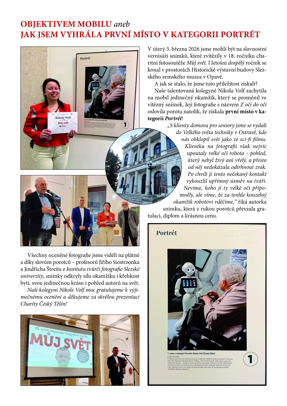 25.03.2026 - V utery 3. března 2026 jsme mohli byt na slavnostní vernisáží snímků, které zvítězily v 18. ročníku charitní fotosoutěže Můj svět. I letošní dospělý ročník se konal v prostorách Historické výstavní budovy Slezského zemského muzea v Opavě. A jak se stalo, že jsme tuto příležitost získali? Naše talentovaná kolegyně Nikola Volf zachytila na mobil jedinečný okamžik, který se proměnil ve vítězný snímek. Její fotografie s názvem Z očí do očí oslovila porotu natolik, že získala první místo v kategorii Portrét! Naší kolegyni Nikole Volf moc gratulujeme k výjimečnému ocenění a děkujeme za skvělou prezentaci Charity Český Těšín! (TRUBAČ, zpravodaj Charity Český Těšín, březen 2026)