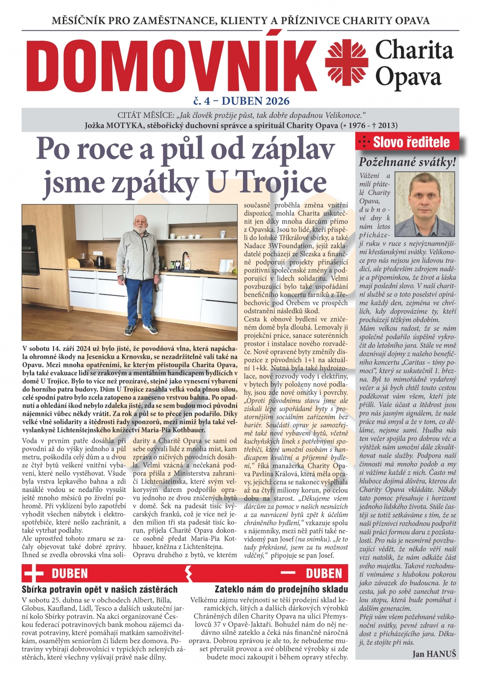 01.04.2026 - Několik ohlédnutí za vydařenými kulturními i společenskými akcemi, které minulý měsíc uspořádala Charita Opava pro veřejnost, ale i takovými, které ve prospěch opavské Charity zorganizovaly některé školy či obce. To je dubnový Domovník, který se ovšem jen neohlíží, ale přináší i čerstvé informace o tom, co se u nás děje a co chystáme.