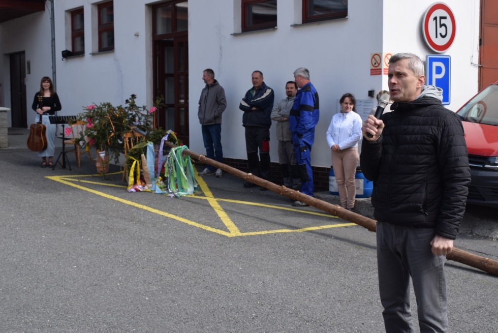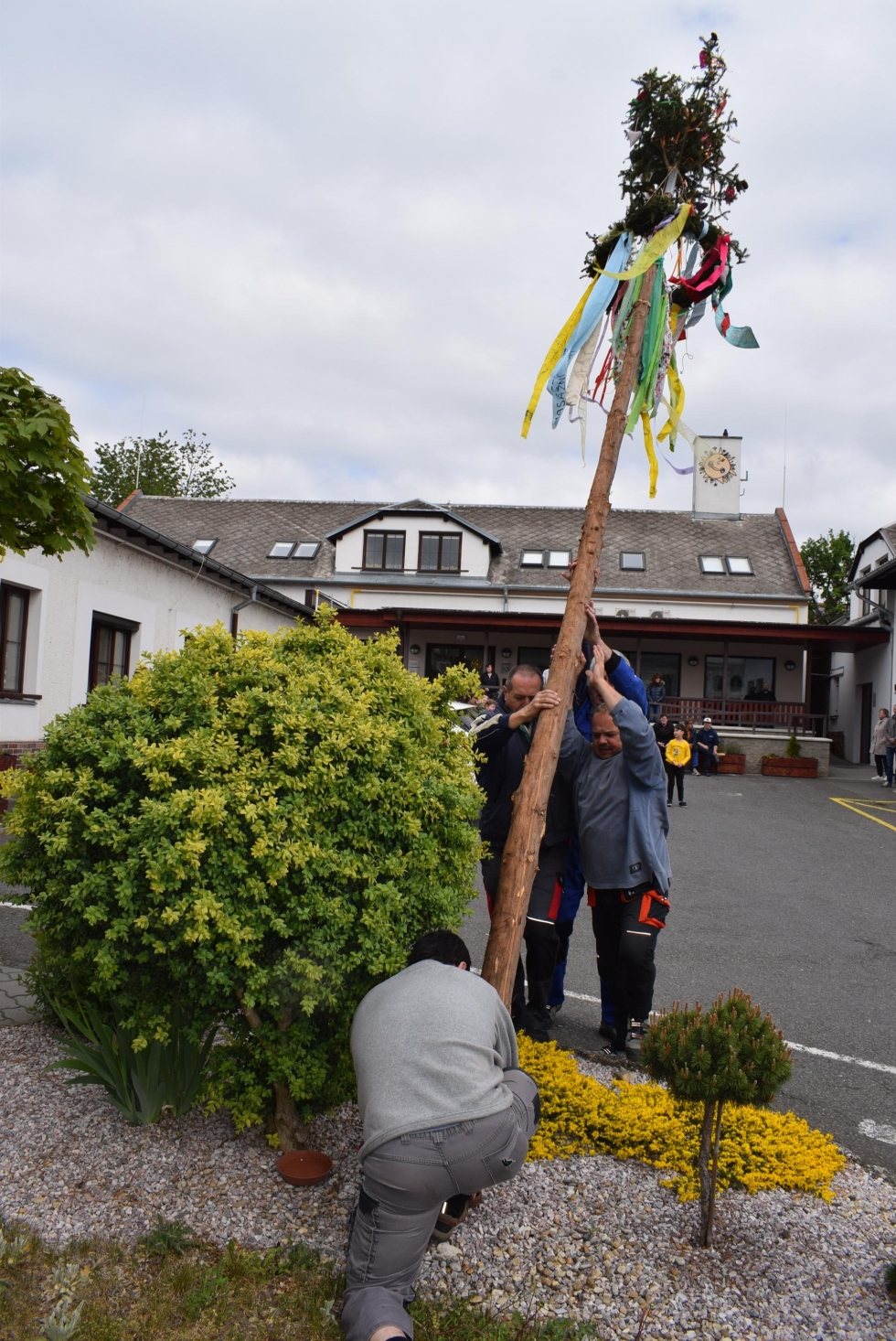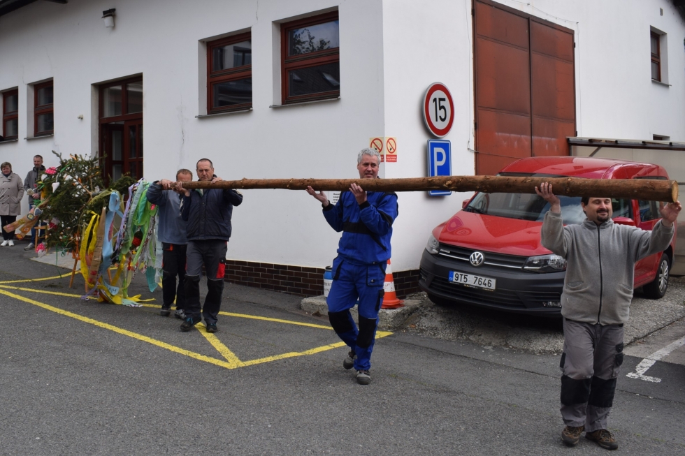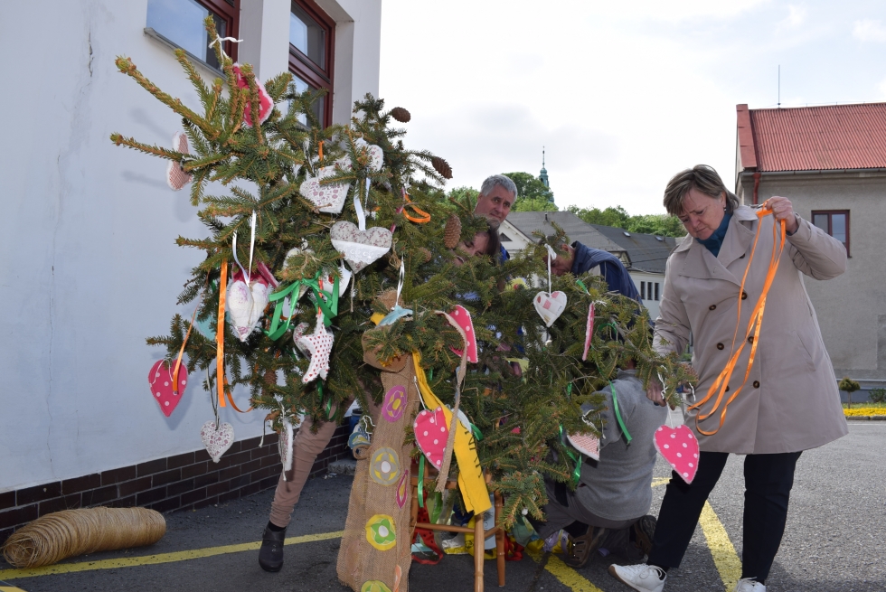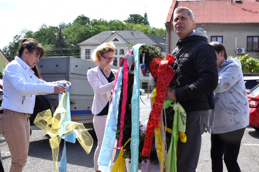 Kompletně nazdobený věnec se vrátil do Jaktaře před polednem, kde svou stuhu jako poslední přidali klienti sociálně terapeutické dílny Radost. Pak už jsme ho připevnili na stožár májky a za doprovodu zpěvu dětí z Církevní základní školy sv. Ludmily slavnostně vztyčili.