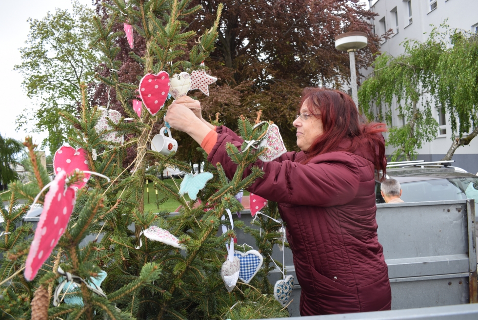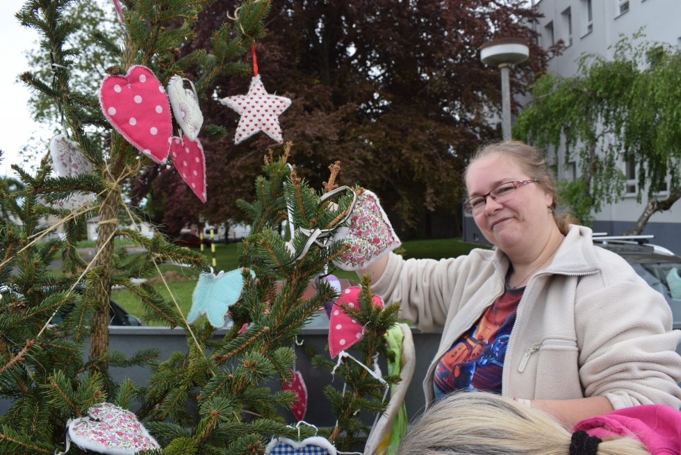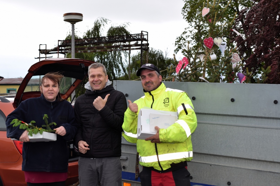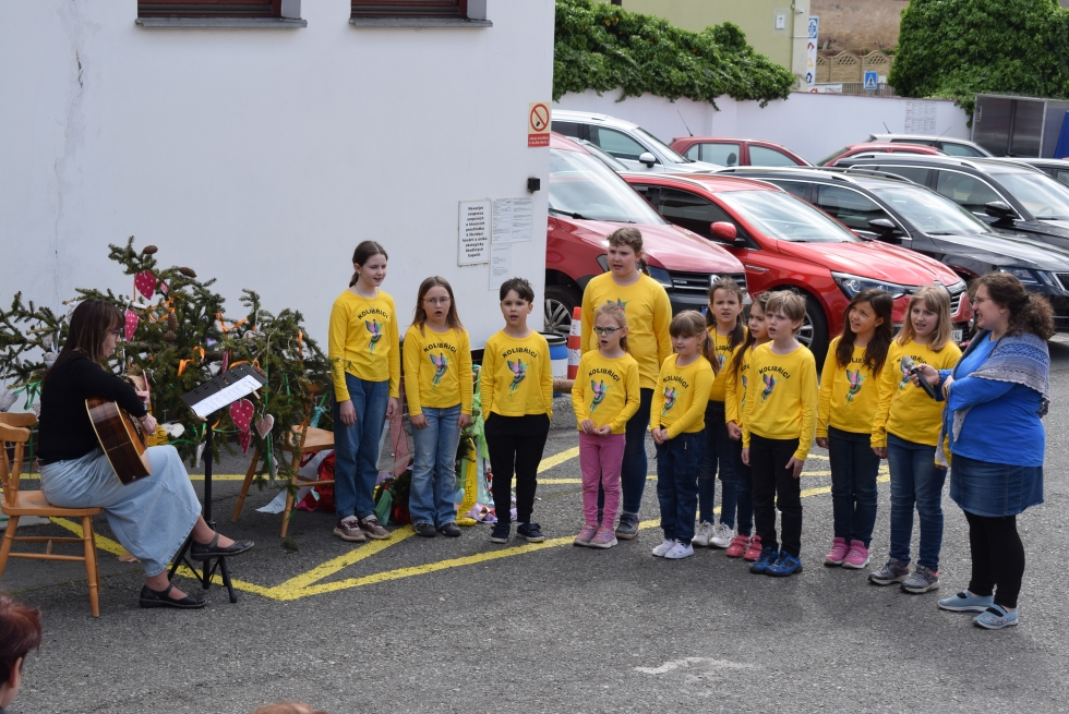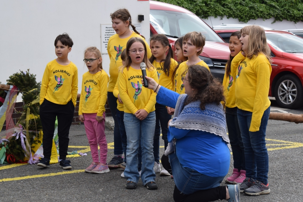 Kompletně nazdobený věnec se vrátil do Jaktaře před polednem, kde svou stuhu jako poslední přidali klienti sociálně terapeutické dílny Radost. Pak už jsme ho připevnili na stožár májky a za doprovodu zpěvu dětí z Církevní základní školy sv. Ludmily slavnostně vztyčili.