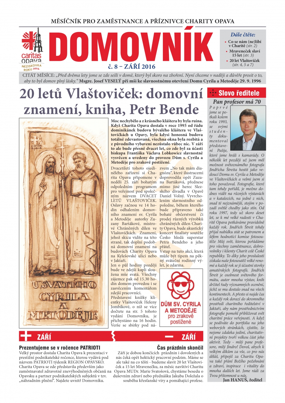 Prázdniny skončily, je zde nový školní rok a s ním také po srpnové pauze zářijový Domovník. Ten je z velké části věnován blížícím se oslavám 20. výročí vzniku Domu sv. Cyrila a Metoděje pro zrakově postižené ve Vlaštovičkách, ale najdete zde i řadu dalších zajímavých nebo užitečných informací.