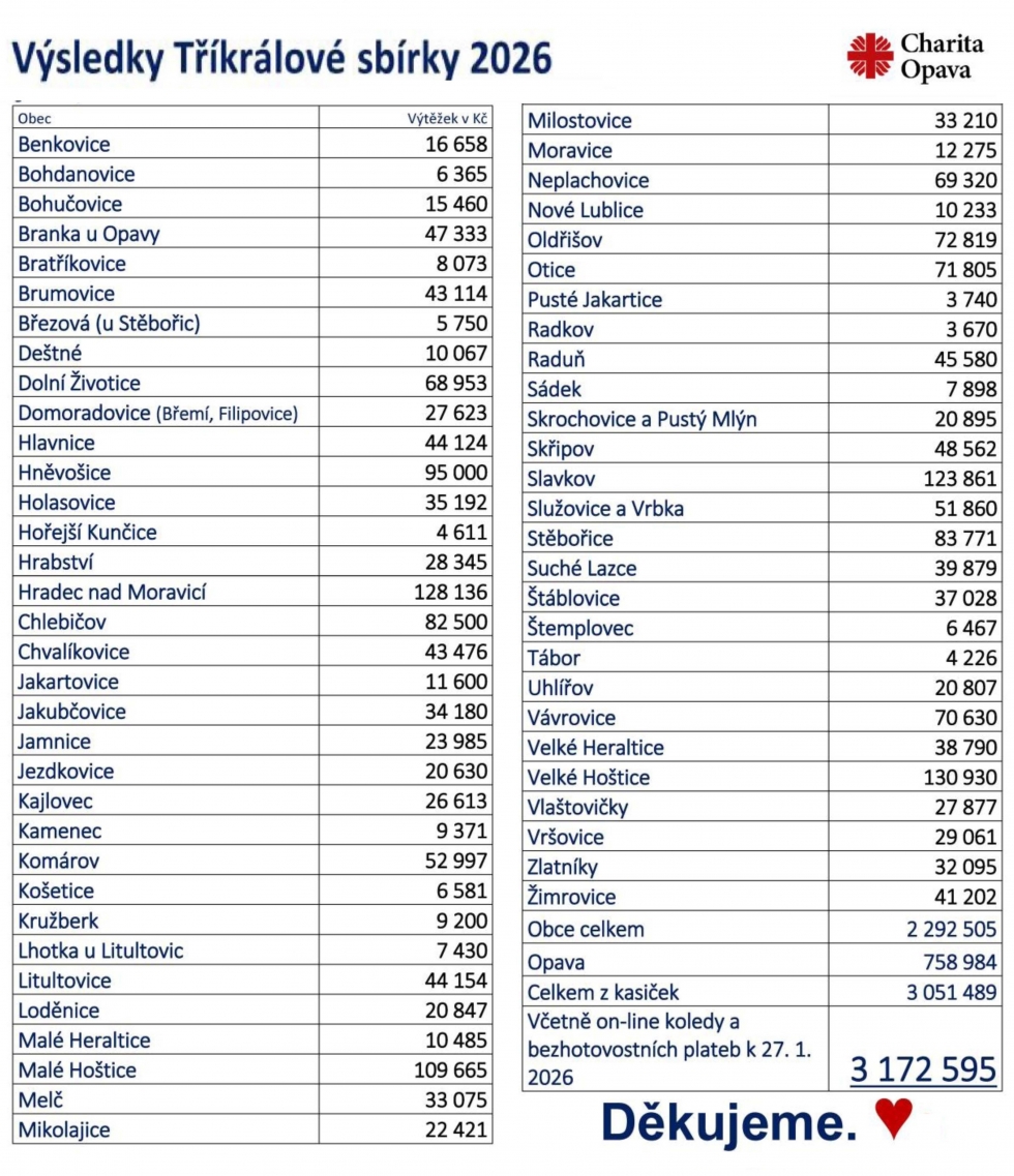 29.01.2026 - Na 3.172.595 korun se k 28. lednu vyšplhala částka, kterou věnovali v Tříkrálové sbírce potřebným lidé na Opavsku. Celkový výsledek navýšily o více než sto tisíc korun dary poslané na tříkrálový účet online především prostřednictvím QR kódu, který měli koledníci umístěný na každé pokladničce. Charita Opava již má také k dispozici rozpis výsledků po jednotlivých obcích. Podívejte se, jak dopadla Tříkrálová sbírka 2026 právě u vás!