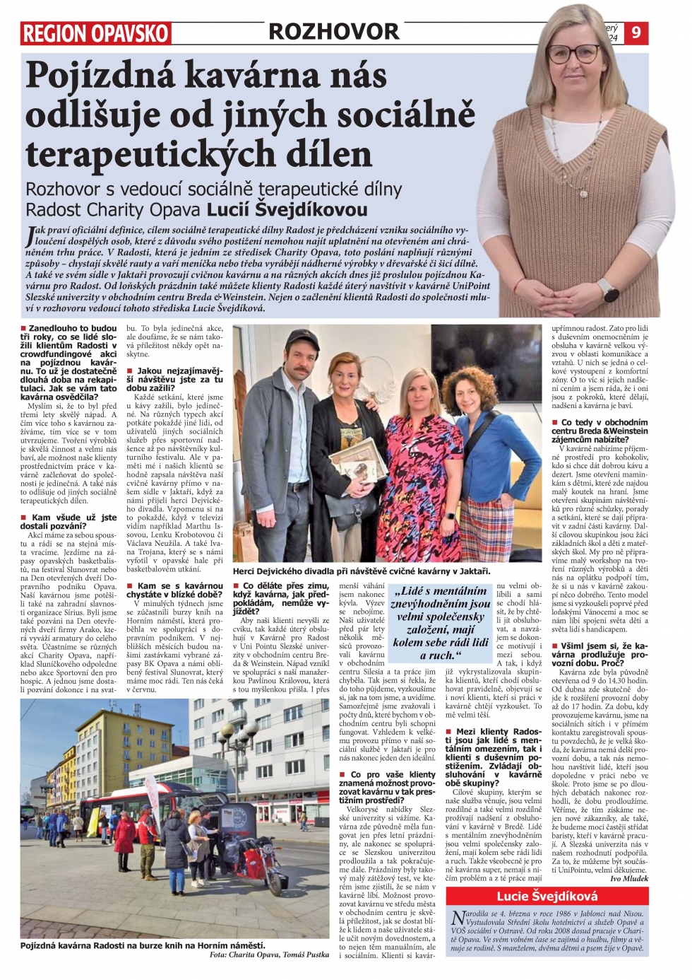 01.04.2024 - V Radosti, která je jedním ze středisek Charity Opava, chystají skvělé rauty a vaří meníčka nebo třeba vyrábějí nádherné výrobky v dřevařské či šicí dílně. A také ve svém sídle v Jaktaři provozují cvičnou kavárnu a na různých akcích dnes již proslulou pojízdnou Kavárnu pro Radost. Od loňských prázdnin také můžete klienty Radosti každé úterý navštívit v kavárně UniPoint Slezské univerzity v obchodním centru Breda &Weinstein. Nejen o začlenění klientů Radosti do společnosti mluví v rozhovoru vedoucí tohoto střediska Lucie Švejdíková. (REGION OPAVSKO, 2. dubna 2024)