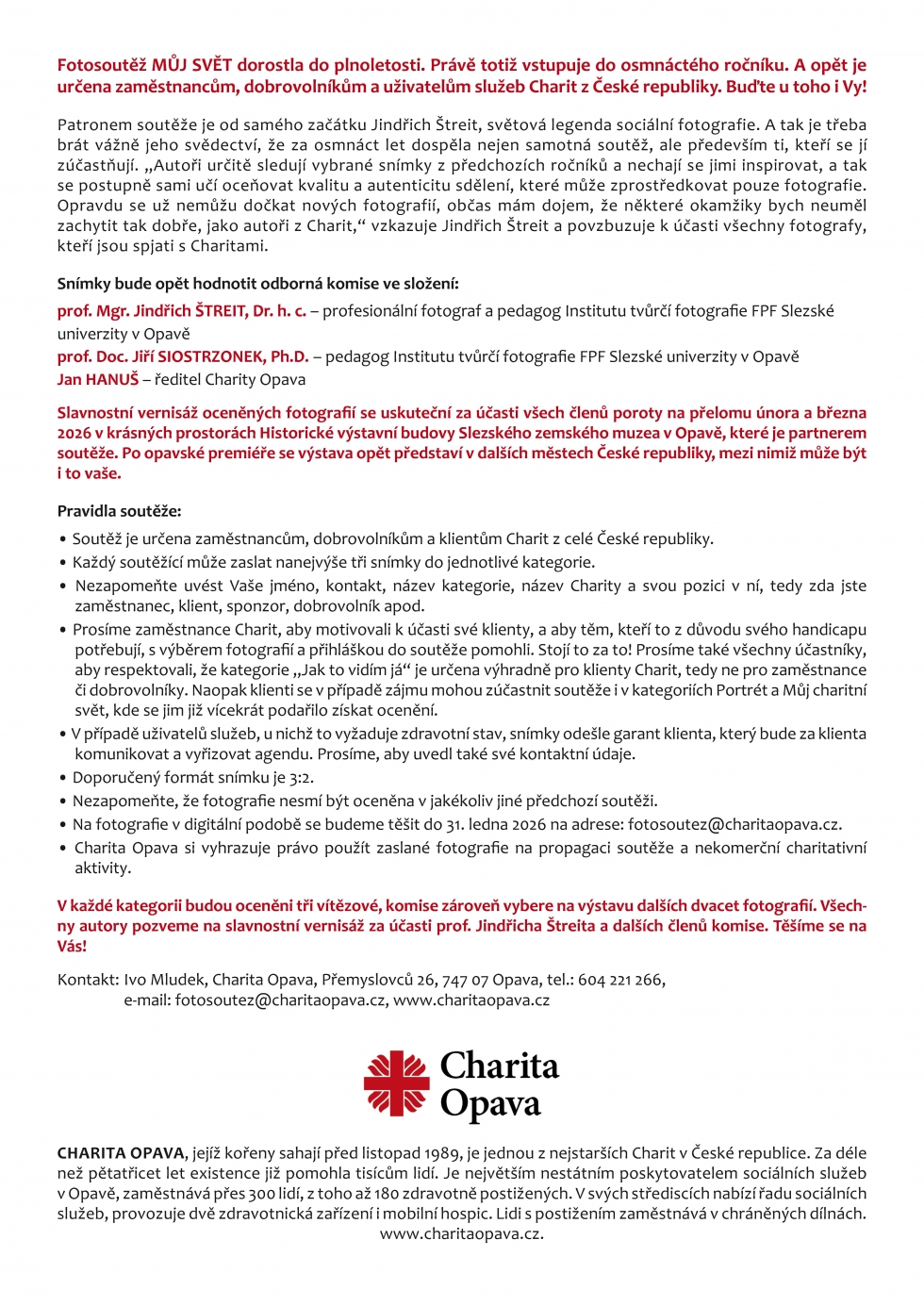 28.01.2026 - Nezapomeňte! Do uzávěrky osmnáctého ročníku fotosoutěže MŮJ SVĚT zbývá několik posledních hodin. O půlnoci ze soboty 31. ledna na 1. února vyprší zaměstnancům, dobrovolníkům a klientům Charit možnost poslat své snímky na adresu fotosoutez@charitaopava.cz.