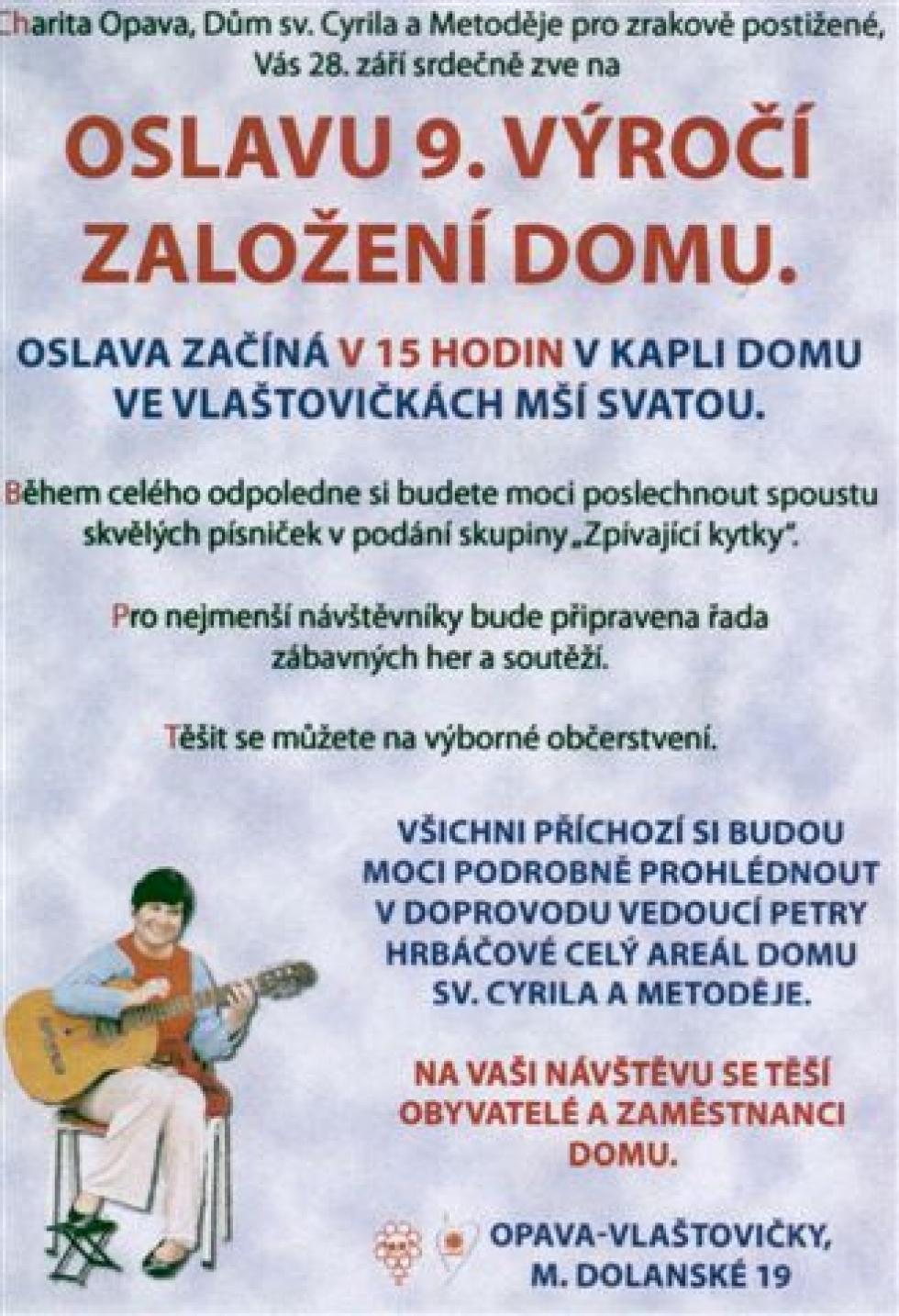 27.09.2005 - CHARITA OPAVA VÁS ZVE NA OSLAVU 9. VÝROČÍ ZALOŽENÍ DOMU SV. CYRILA A METODĚJE PRO ZRAKOVĚ POSTIŽENÉ VE VLAŠTOVIČKÁCH