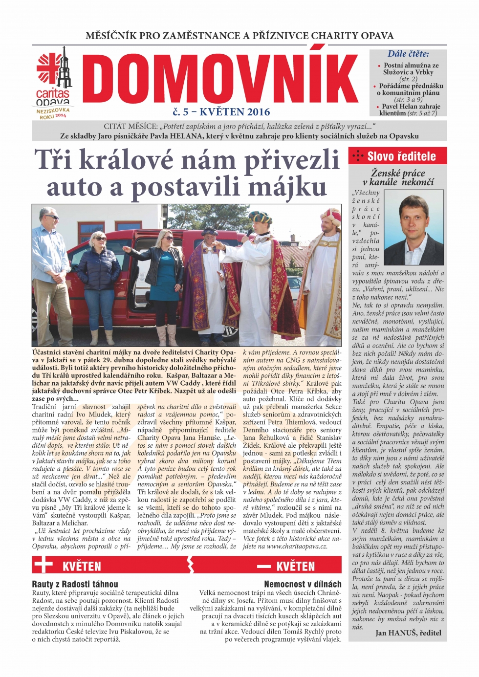29.04.2016 - Letošní máj začal v Charitě Opava netradičně - májku na dvoře našeho ředitelství postavili Tři králové, kteří nám přivezli speciálně upravenou dodávku VW Caddy. A mnoho dalších netradičních akcí nás teprve čeká - koncert Písničkáře Pavla Helana pro klienty sociálních služeb, přednáška o komunitním plánu... Toto a mnoho dalšího najdete v aktuálním májovém Domovníku.