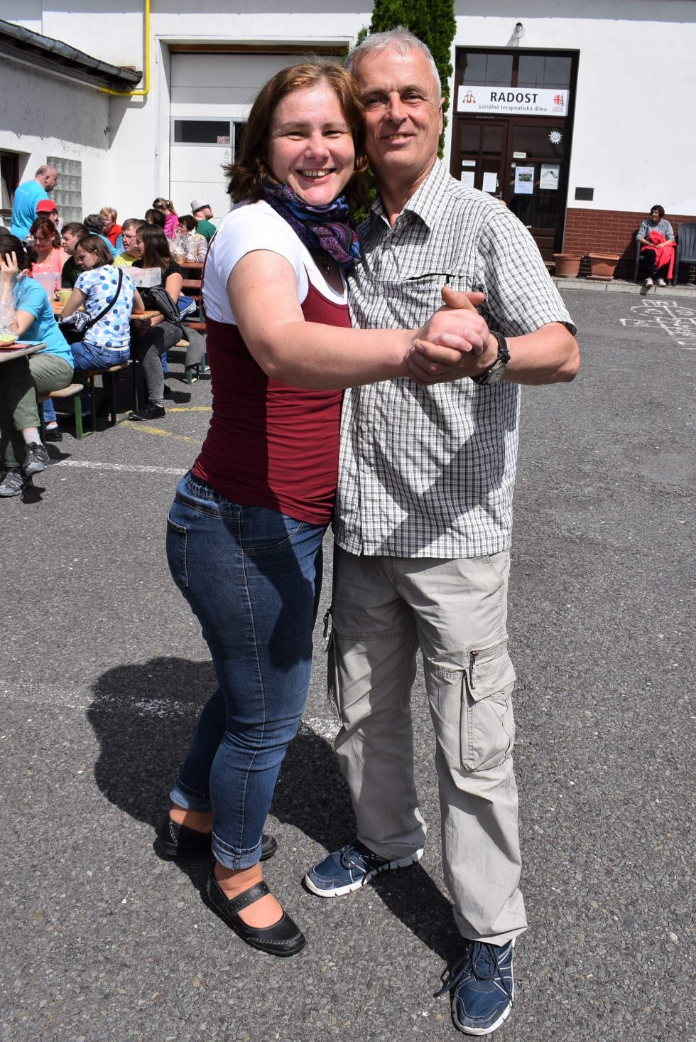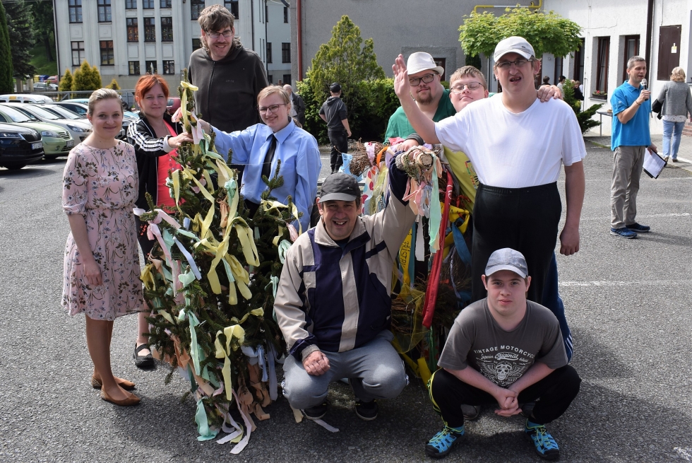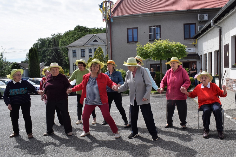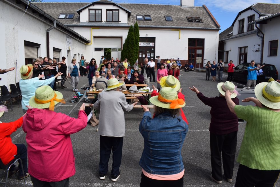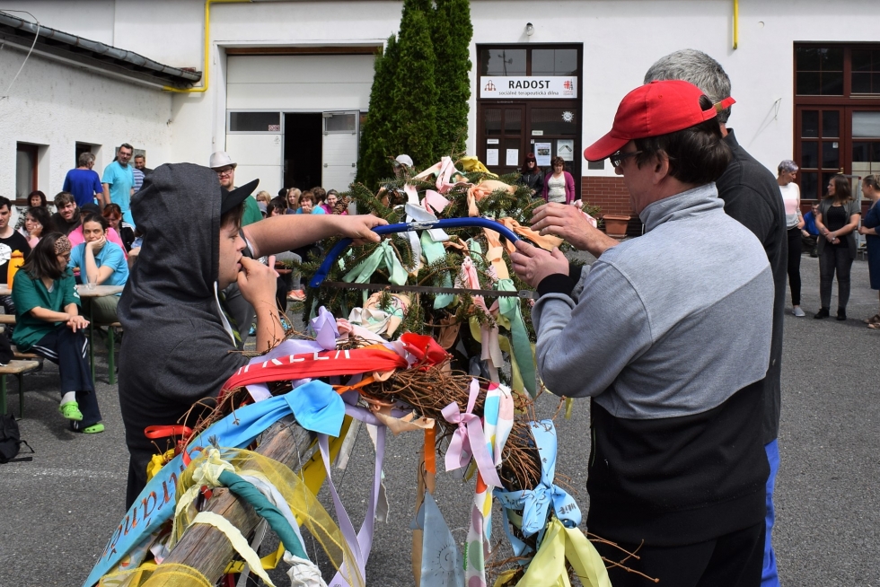 Na kácení májky mohli díky pěknému počasí dorazit nejen klienti a zaměstnanci Radosti a Chráněných dílen sv. Josefa, ale také z Domu sv. Cyrila a Metoděje ve Vlaštovičkách, Chráněného a podporovaného bydlení, historicky poprvé také z Chráněné technické dílny v Hošticích a Denního stacionáře pro seniory. A právě dámy ze stacionáře se postaraly o skvělý program, když svým tanečním vystoupením zastoupily děti z jaktařské mateřské školy, které v pátek bohužel nemohly přijít. Po rozcvičovací písničce Vlaštovka přišla na řadu divoká Macarena, která roztančila celý dvůr.