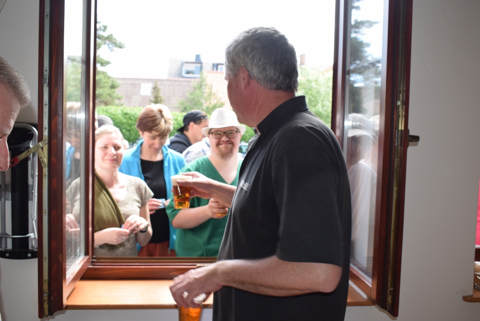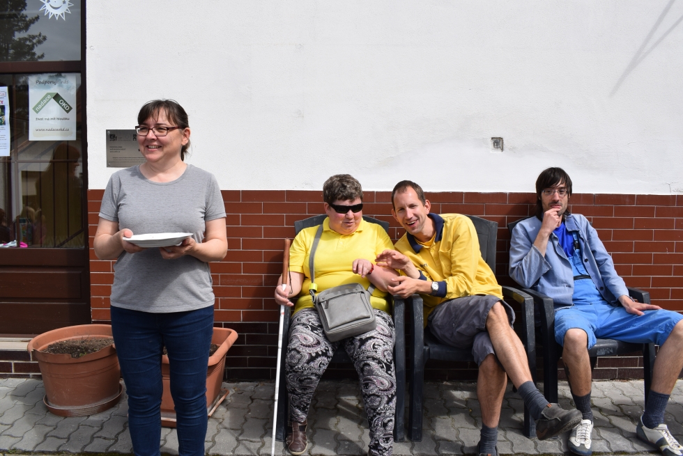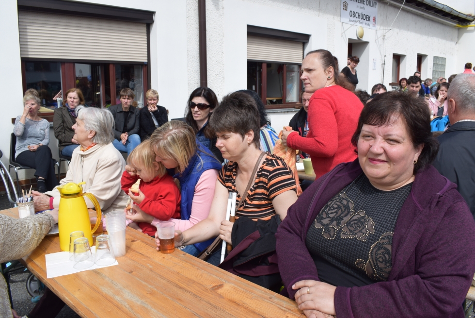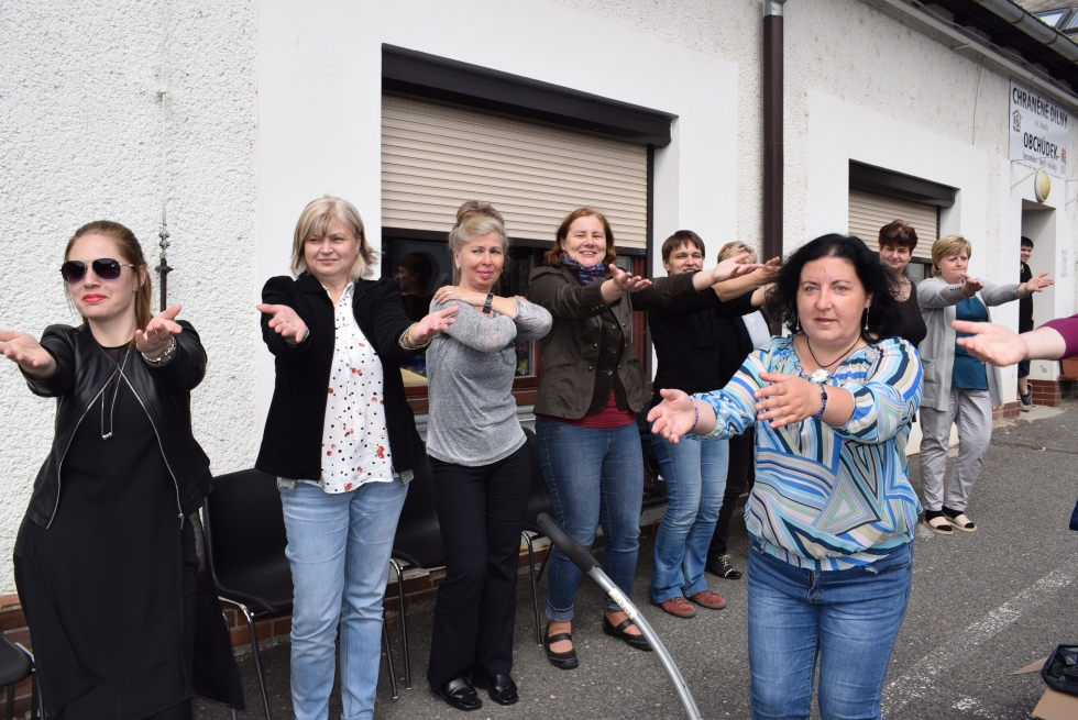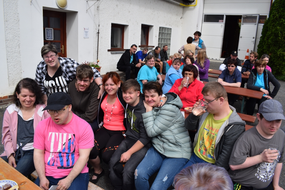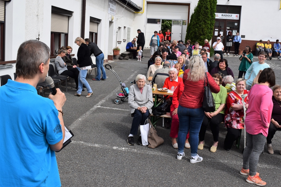 Na kácení májky mohli díky pěknému počasí dorazit nejen klienti a zaměstnanci Radosti a Chráněných dílen sv. Josefa, ale také z Domu sv. Cyrila a Metoděje ve Vlaštovičkách, Chráněného a podporovaného bydlení, historicky poprvé také z Chráněné technické dílny v Hošticích a Denního stacionáře pro seniory. A právě dámy ze stacionáře se postaraly o skvělý program, když svým tanečním vystoupením zastoupily děti z jaktařské mateřské školy, které v pátek bohužel nemohly přijít. Po rozcvičovací písničce Vlaštovka přišla na řadu divoká Macarena, která roztančila celý dvůr.