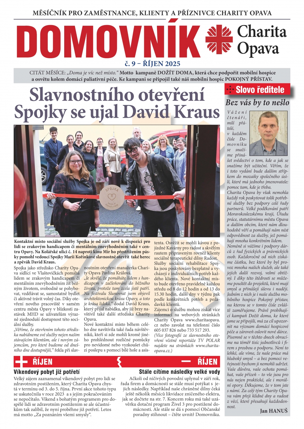 01.10.2025 - V říjnu nás čeká celostátní kampaň Dožít doma pořádaná Fórem mobilních hospiců. I proto se v části říjnového Domovníku věnujeme našemu mobilnímu hospici Pokojný přístav, který se do kampaně také zapojí. Ale najdete zde i řadu dalších témat – například potřebné informace o dotačním programu Živel 3, v němž si mohou lidé, jejichž obydlí bylo zasaženo povodněmi, do konce roku zažádat o finanční podporu, o návštěvě opavských basketbalistů v Radosti, chystaném charitním plese a mnoho dalšího.