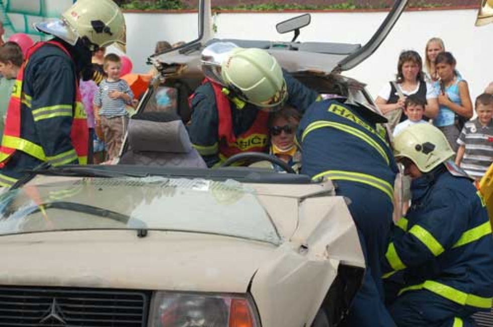 „Překvapení bylo dokonalé, ani ředitel organizace nevěděl co to bude,“ komentuje ukázku cvičného zásahu Hasičského záchraného sboru Hana Matějíčková a pokračuje: „Na auto vrakovišti jsme domluvili jeden starý vůz, do které jsme posadili kolegu i přes jeho protesty. Pak jsme čekali jak se s problémem fingované havárie profesionální hasiči vypořádají.“ Vypořádali se s tím naprosto skvělé. Za houkání sirény přijeli do dvora, z auta vyskákalo pět mužů v plné výstroji a pustili se do práce. Nejdříve za uvízlým řidičem zadním oknem vlezl hasič záchranář, aby navázal kontakt s řidičem a poskytl mu první pomoc. Ostatní mezitím pneumatickými kleštěmi nenávratně otevřeli jedny i druhé dveře a ještě z kapotovaného vozu udělali kabrio. Řidiče vyprostili, naložili na nosítka a poodnesli pár metrů. Ačkoli se jednalo o profesionální zásah, každý byl rád, že to nebylo „doopravdy“.