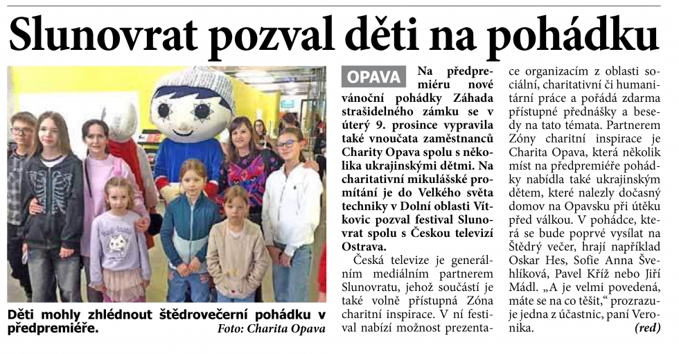 16.12.2025 - Na předpremiéru nové vánoční pohádky Záhada strašidelného zámku se v úterý 9. prosince vypravila také vnoučata zaměstnanců Charity Opava spolu s několika ukrajinskými dětmi. Na charitativní mikulášské promítání je do Velkého světa techniky v Dolní oblasti Vítkovic pozval festival Slunovrat spolu s Českou televizí Ostrava. (REGION OPAVSKO, 16. prosince 2025)
