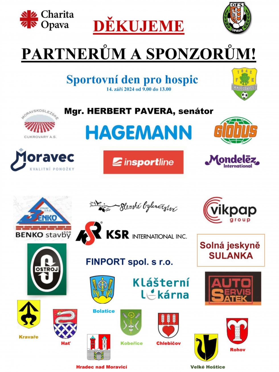 Na úspěchu Benefičního sportovního dne pro hospic se finančně podíleli Auto Tomáš Sátek, BENKO stavby s.r.o., FINPORT spol. s.r.o., Klášterní lékárna, KSR Industrial s.r.o., Ostroj a.s., VIKPAP GROUP s.r.o., města Hradec nad. Moravicí a Kravaře a obce Bolatice, Hať, Chlebičov, Kobeřice, Rohov a Velké Hoštice.