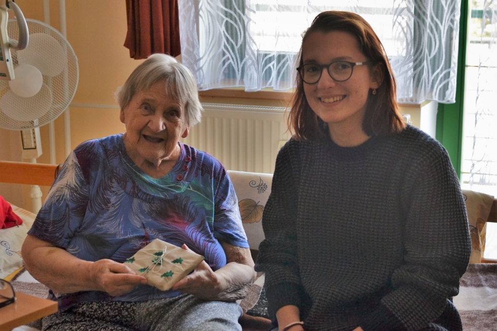 „Do Pečovatelské služby Charity Opava jsme se přihlásily samy. Od maminky Marušky Komárkové, která pracovala v mobilním hospici Charity Opava, jsme věděly, že zde dobrovolníky nutně potřebují,“ vysvětluje jedna z oceněných, studentka druhého ročníku oboru Charitativní a sociální práce Marie Hanušová (na snímku při dobrovolnické práci ještě před koronakrizí, tedy bez roušky). Ona sama v Charitě Opava strávila jako dobrovolnice měsíc, její spolužačka, která je ve třetím ročníku stejného oboru, dokonce tři měsíce.