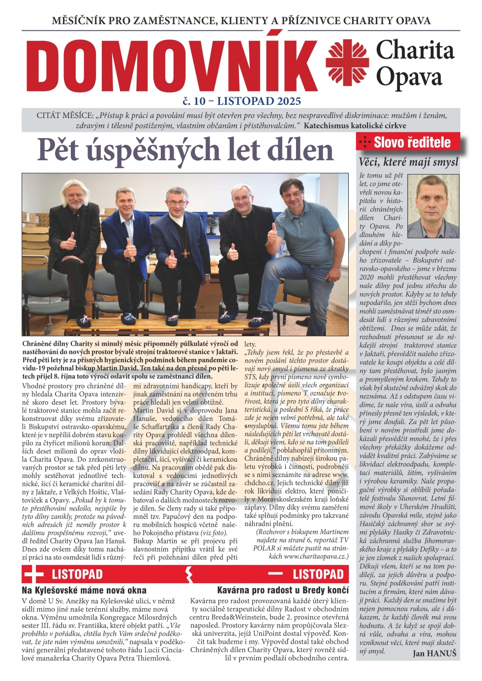 31.10.2025 - Listopadovému Domovníku dominují dvě témata. Vracíme se k výročí pěti let od chvíle, kdy se naše chráněné dílny, do té doby sídlící na různých místech, sestěhovaly do nových prostor bývalé strojní traktorové stanice v Jaktaři. Jak to hodnotí biskup Martin David, se dočtete v hlavním rozhovoru Domovníku. Tím druhým neméně důležitým tématem je připomínka nenápadné, ale nenahraditelné práce našich pečovatelek.