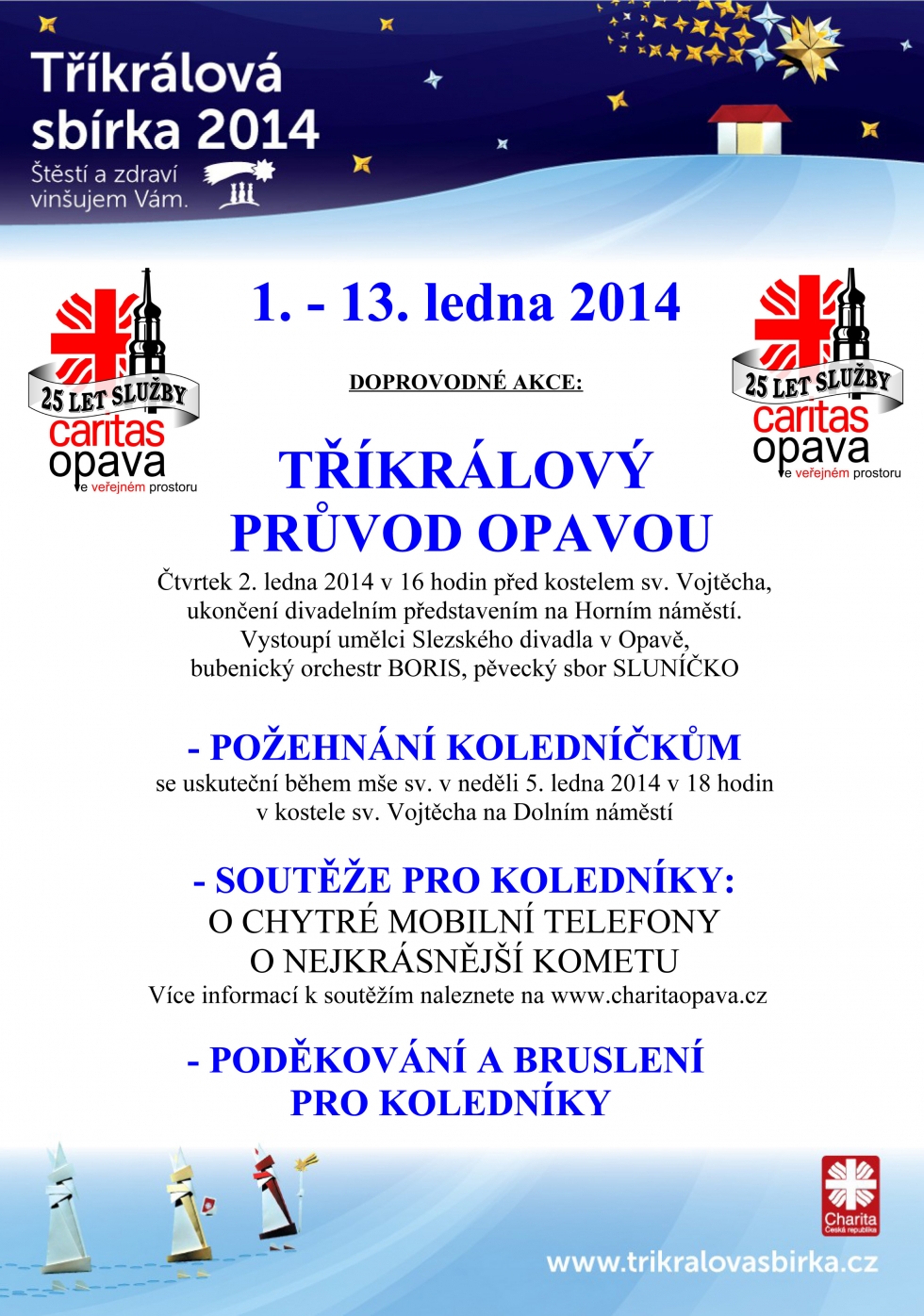 Možná i u vás zaklepou v první polovině ledna příštího roku na dveře koledníci, aby tak jako na tisících místech celé České republiky poprosili o příspěvek na charitní dílo a zvěstovali radost i naději v solidaritu a vzájemnou pomoc. Tříkrálová sbírka proběhne již po čtrnácté v termínu od 1. do 13. ledna 2014. Kromě Tříkrálového průvodu, během něhož vystoupí bubenický orchestr BORIS, pěvecký sbor Sluníčko a v krátkém představení také herci Slezského divadla v Opavě, je také připravena celá řada atrakcí pro koledníky – od požehnání během mše v neděli 5. ledna 2014 v 18 hodin v kostele sv. Vojtěcha na Dolním náměstí v Opavě až po závěrečné bruslení zdarma a tradiční soutěž o nejhezčí Tříkrálovou korunku. Novinkou je kolednická soutěž o tři chytré mobilní telefony a možnost si koledníky objednat - pokud někoho koledníci při poslední sbírce nenavštívili a on by je přesto rád uvítal, může poslat do konce roku 2013 prosbu formou SMS na tel. 604 175 518 nebo se ohlásit na e-mailu gilikova@charitaopava.cz a v lednu 2014 na jeho dveře Kašpar, Melichar a Baltazar určitě zaklepou.