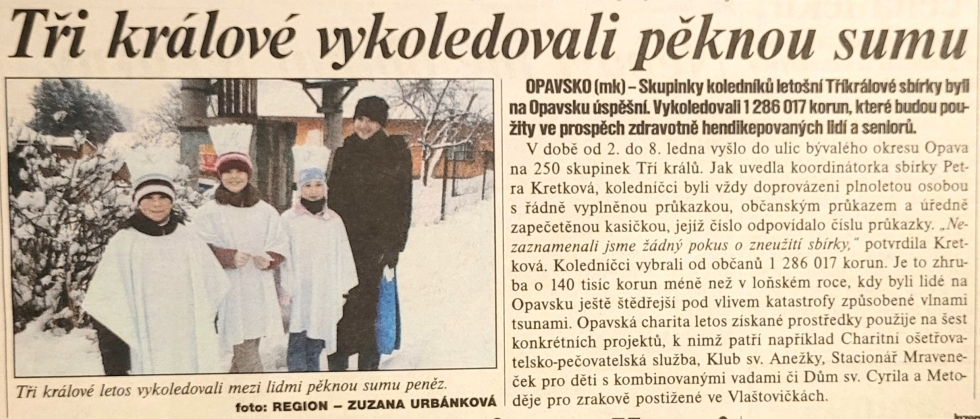 13.01.2026 - Skupinky koledníků Tříkrálové sbírky byly úspěšné. To hlásaly titulky opavských médií před dvaceti lety. Lidé na Opavsku přispěli do tříkrálových kasiček v roce 2006 částkou přes jeden milion dva stě tisíce korun. Před dvaceti lety se koledovalo během kratší doby, než letos, a to pouze od 2. do 8. ledna. Letošní Tříkrálová sbírka, která je opět určená pro potřebné lidi v našem regionu, trvá od 1. ledna až do 14. ledna, tak máte stále možnost se připojit. Nebo přispět online až do konce ledna na třikrálový účet, jehož číslo najdete na stránkách www.charitaopava.cz. Jaký asi bude letošní výsledek? (REGION OPAVSKO 13. ledna 2026 v rubrice Před dvaceti lety)