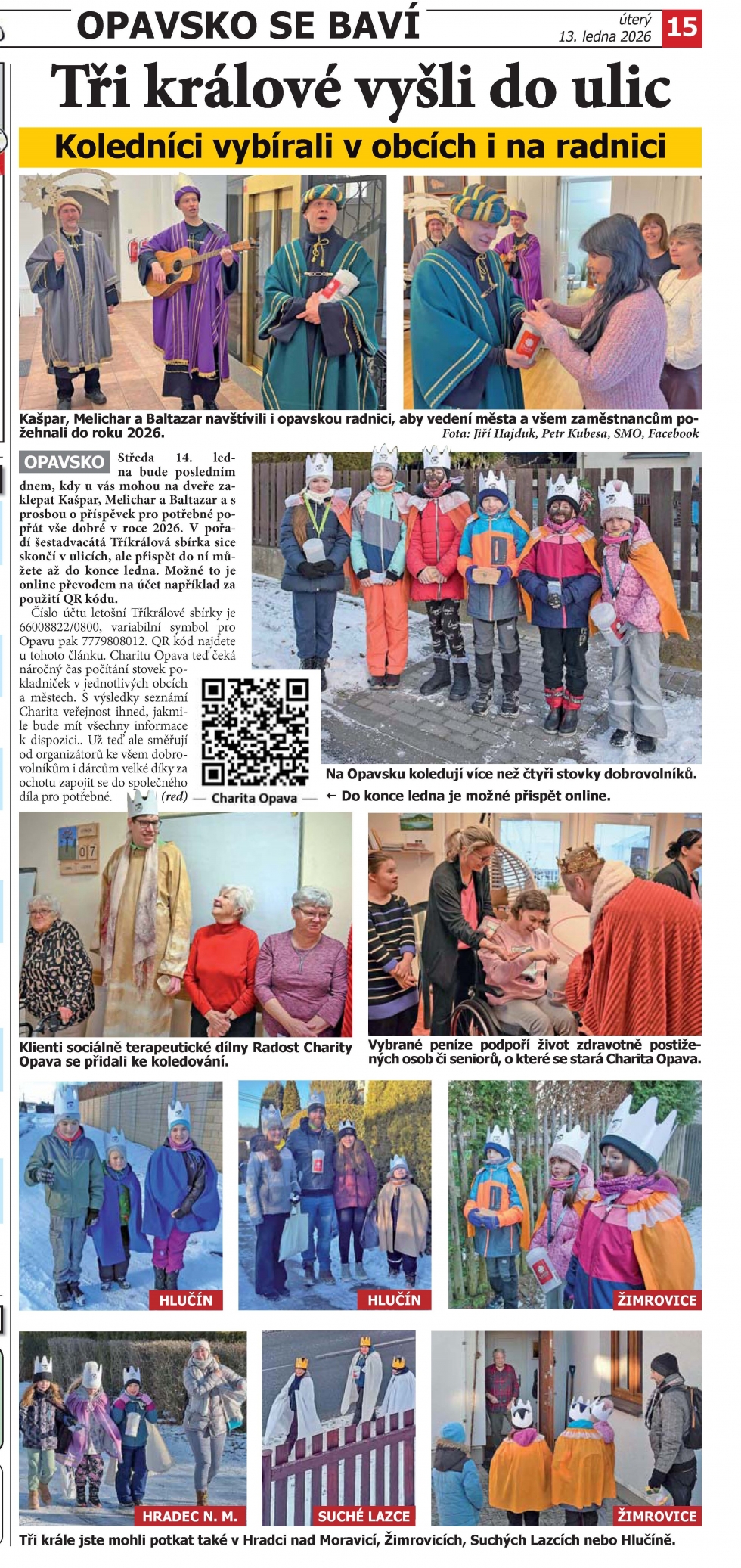 16.01.2026 - Středa 14. ledna byla posledním dnem, kdy u vás mohli na dveře zaklepat Kašpar, Baltazar a Melichar s prosbou o příspěvek pro potřebné vám popřát vše dobré v roce 2026. V pořadí šestadvacátá Tříkrálová sbírka sice skončila v ulicích, ale přispět do ní můžete až do konce ledna. Možné to je on-line převodem na účet například za použití QR kódu.
