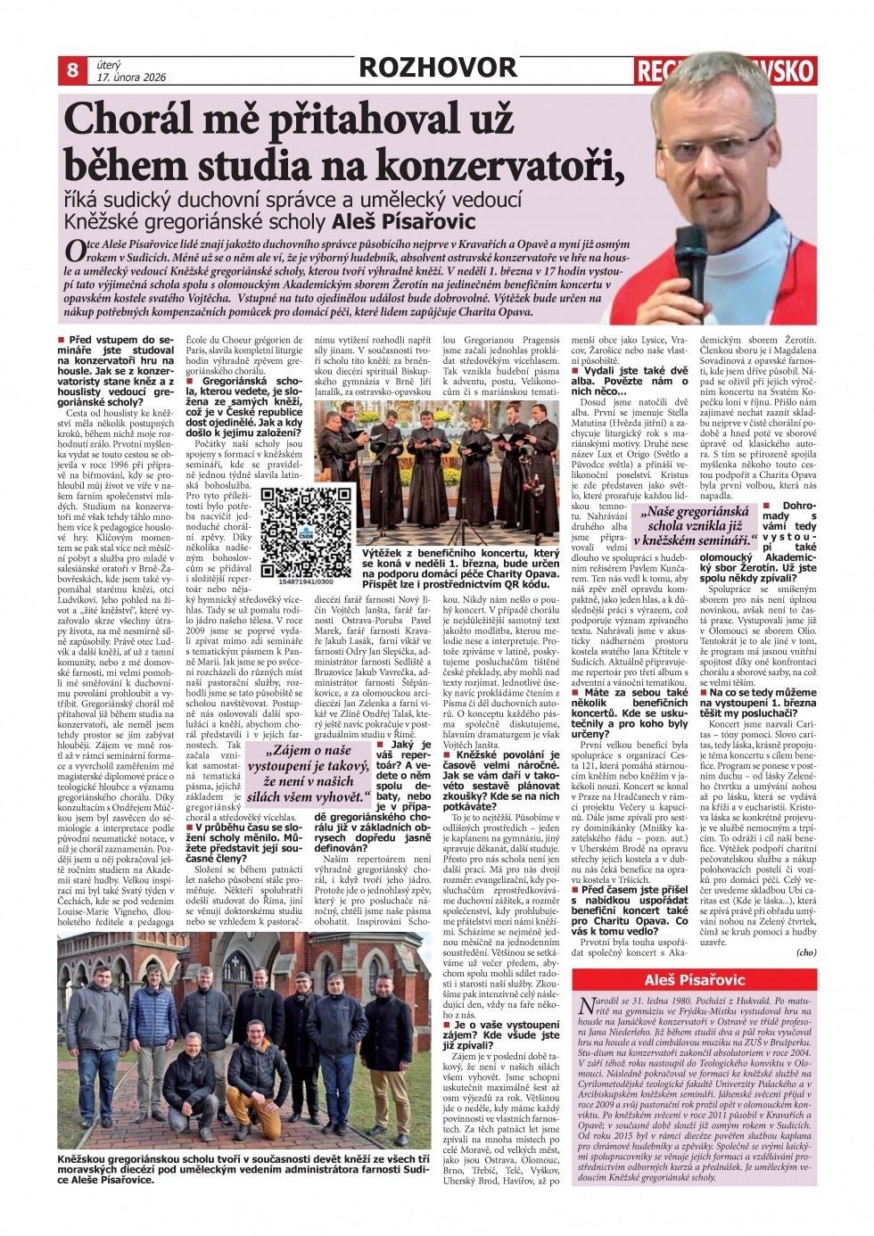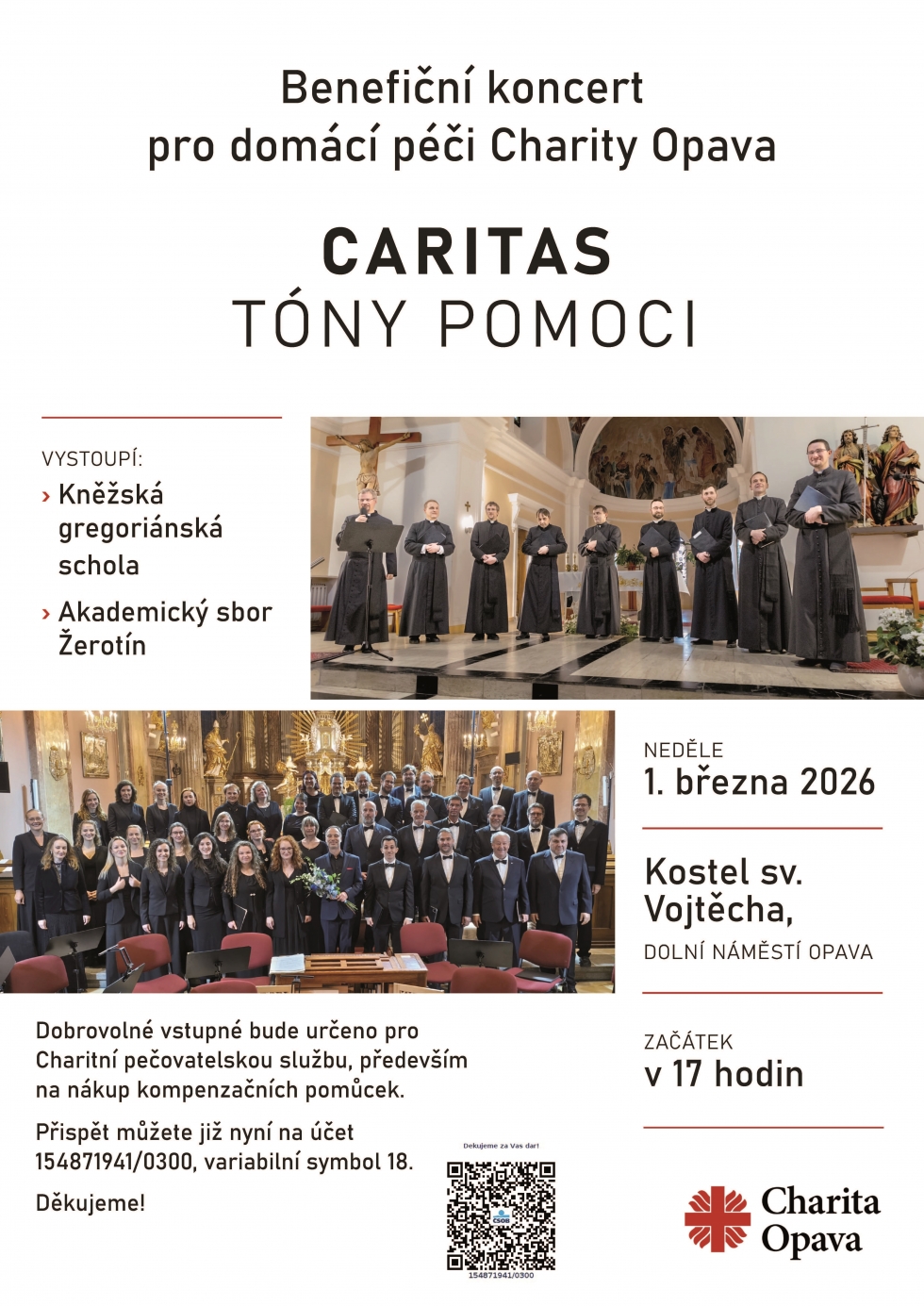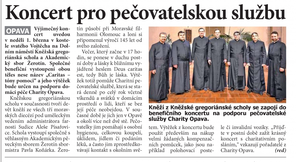 25.02.2026 - Už tuto neděli budete mít možnost navštívit v kostele sv. Vojtěcha na Dolním náměstí v Opavě výjimečný koncert Kněžské gregoriánské scholy a Akademického sboru Žerotín s názvem „Caritas – tóny pomoci“. Výtěžek bude určen na podporu domácí péče Charity Opava. Pozvánku vysílá také TV NOE, podívejte se!