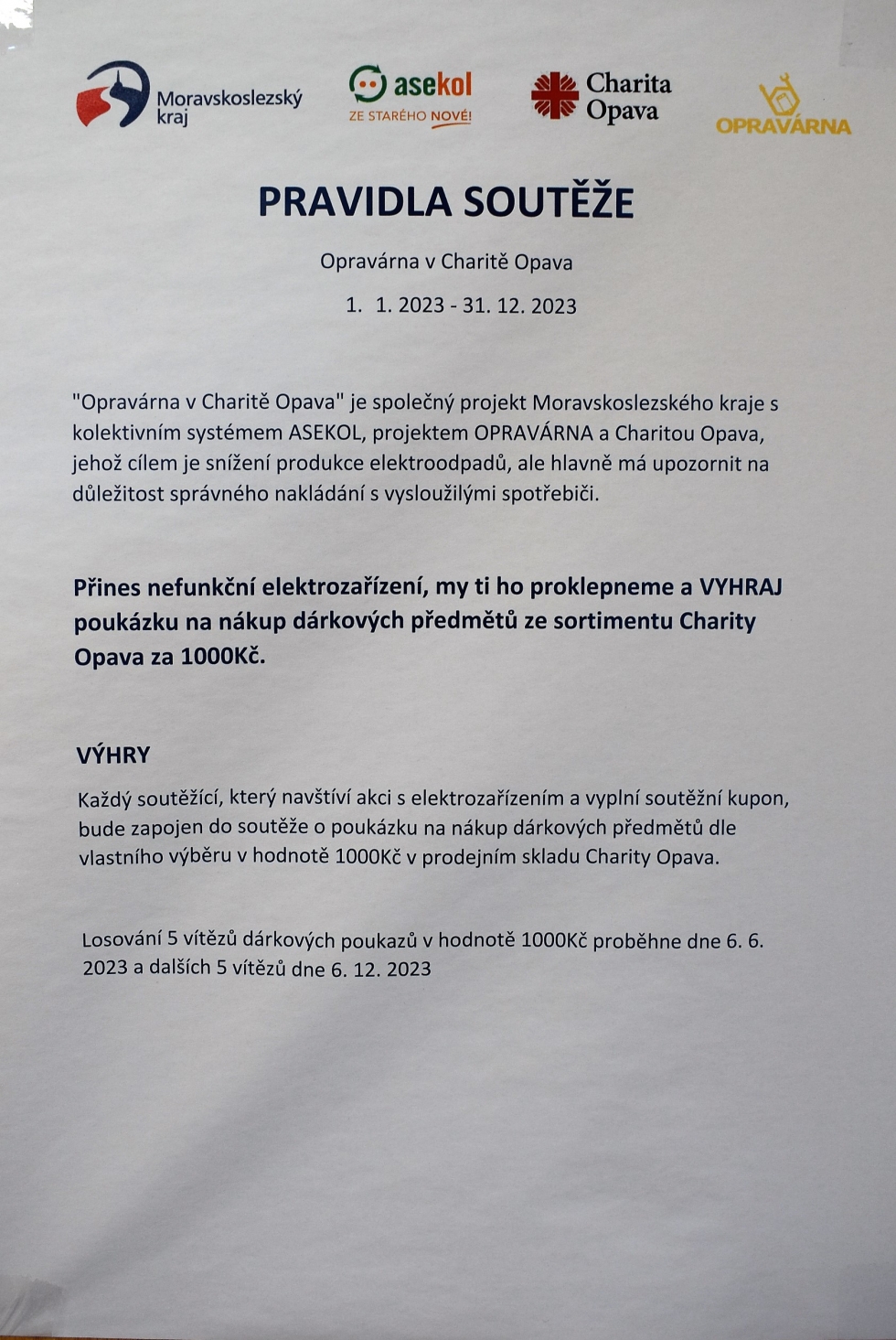 V sobotu 2. dubna od 9 do 17 hodin mohou zájemci přinášet lehkou bílou techniku, černou techniku jako televize, mobily, počítače notebooky a různé audio či video přehrávače. S technikem je také možno případné opravy konzultovat dopředu na tel. čísle 734 130 467. Opravárna je společným projektem společnosti ASEKOL, Charity Opava a Moravskoslezského kraje.