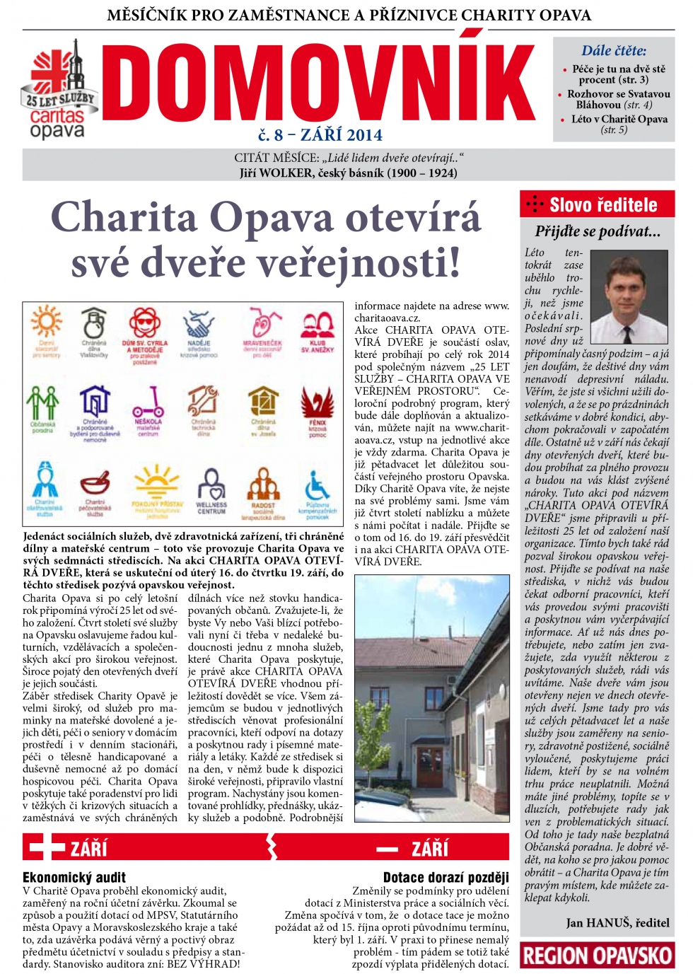 28.08.2014 - Prázdniny utekly jako voda, je tady září a spolu s ním také nový Domovník Charity Opava. Přejeme zajímavé čtení k úspěšné aklimatizaci po zasloužených dovolených.